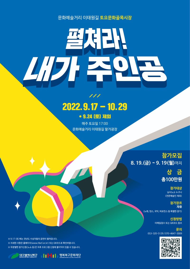 ![]() 행복북구문화재단 공고 제2022-76호 2022 문화예술거리 이태원길 토요문화골목시장 <펼쳐라! 내가 주인공> 참가자 모집 지역주민이 주인공이 되어 펼쳐지는 주민경연대회로 본인의 끼와 장기를 자랑하며 주민 모두가 함께 즐기는 문화의 장을 만들고자 주민경연대회 <펼쳐라! 내가 주인공>의 참가자를 모집하오니 많은 관심과 참여를 부탁드립니다. 2022년 8월 19일 재단법인 행복북구문화재단 이사장