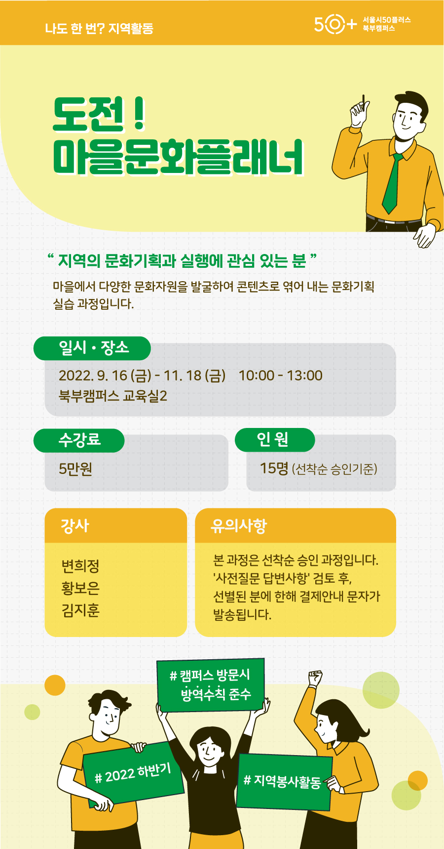 | (10 회차) 2022.11.18(10:00 ~ 13:00) | 교육실 2(외부대관 불가) | 변희정 | [‘마을문화플래너’의 첫 번째 콘텐츠 시범운영(2)]