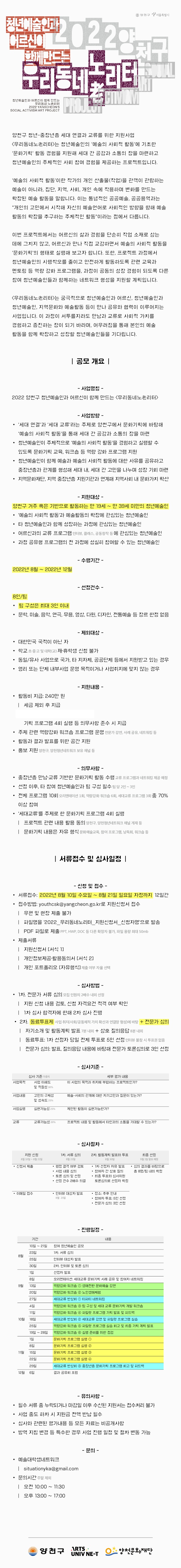 | 분야·대상 | 양천구 거주 혹은 기반으로 활동하는 만 19세 ~ 만 39세 미만의 청년예술인 | 인원 | 8인/팀 |