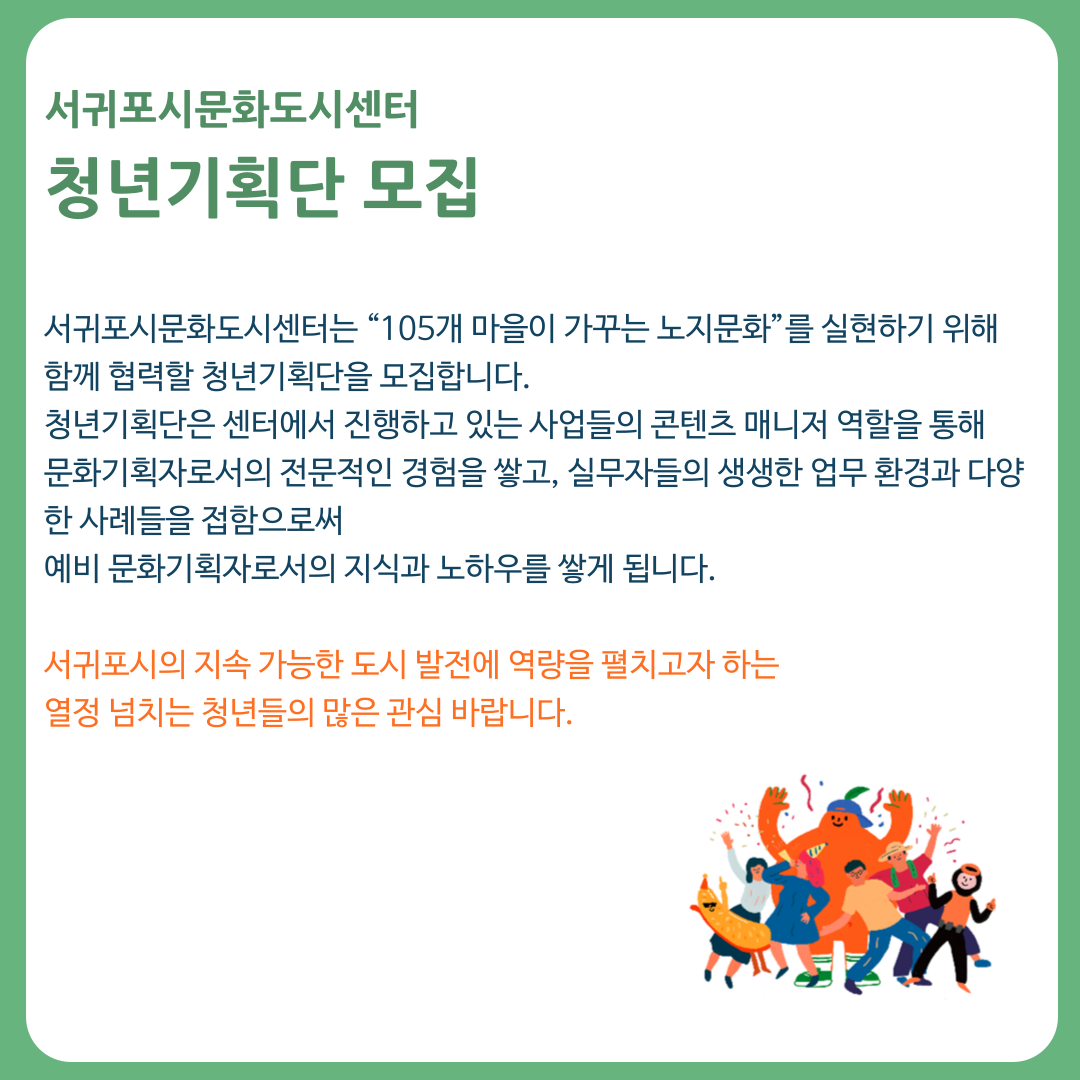 ![]() ❍ 청년기획단 주요 활동 내용 ∙ 업무 활동 - 문화도시를 만드는 문화기획 (콘텐츠 기획 등) - 서귀포시문화도시센터 온-오프라인 홍보 (예: 홈페이지 및 SNS 관리 등) ∙ 학습 활동 - 문화기획 역량 교육 (사업 기획 및 사업계획서 작성 교육 등) - 행정 실무교육 (공문서 작성 등) - 문화기획 관련 리서치 ❍ 지원요건 - 제주도에 주소지가 있으며 제주도에 거주하고 있는 29세 이하 청년 - 문화도시 서귀포의 비전에 공감하여 지속가능한 서귀포시를 함께 만들어가고 싶은 청년 - 주변을 존중하고, 적극적으로 소통하며 협력할 의지가 있는 청년 - 긍정적이고 적극적인 마인드로 맡은 업무를 책임감 있게 하고자 하는 청년 ❍ 근무조건 - 모집인원: 2명 - 근무기간: 9월~12월 (자세한 일정은 추후 협의) - 근무일정: 월~금 주 5일 근무 (09:00~18:00 / 주 1회 학습 및 리서치 포함) - 근 무 지: 서귀포시문화도시센터 (제주특별자치도 서귀포시 홍중로 33) - 급여조건: 월 2,227,940원(2022년 제주형 생활임금/ 4대 보험 가입) ※ 적합한 지원자가 없을 경우 모집 인원은 조정될 수 있음 ※ 근무일정은 센터 운영 상황에 따라 변경될 수 있음 ❍ 우대사항 - 한글(HWP), MS(엑셀, 워드, 파워포인트 등)을 활용한 문서 작성이 가능한 청년 - 문화 관련 기관 활동 및 문화기획 경험이 있는 청년 ❍ 모집일정 - 모집공고: 2022. 8. 8(월) ~ 8. 21. (일) - 지원서 접수: 2022. 8. 8(월) ~ 8. 21. (일) - 1차 서류전형 발표: 2022. 8. 22.(월) 개별통보 예정 - 2차 인터뷰: 2022. 8. 26.(금) 예정 - 최종 발표: 2022. 8. 29.(월) 개별통보 예정 - 활동 시작일: 2022. 9. 1.(수) 이후 예정 ※ 일정은 센터 사정 및 지원 상황에 따라 변경될 수 있음 ❍ 접수방법: 지원서 작성 후 이메일(seosseung2@gmail.com) 접수 ❍ 제출서류: 활동지원서, 자기소개서, 개인정보수집이용동의서 각 1부 (문화도시 서귀포 홈페이지-공지사항에서 양식 다운로드 후 작성) ❍ 문 의: seosseung2@gmail.com (이메일 문의만 가능)