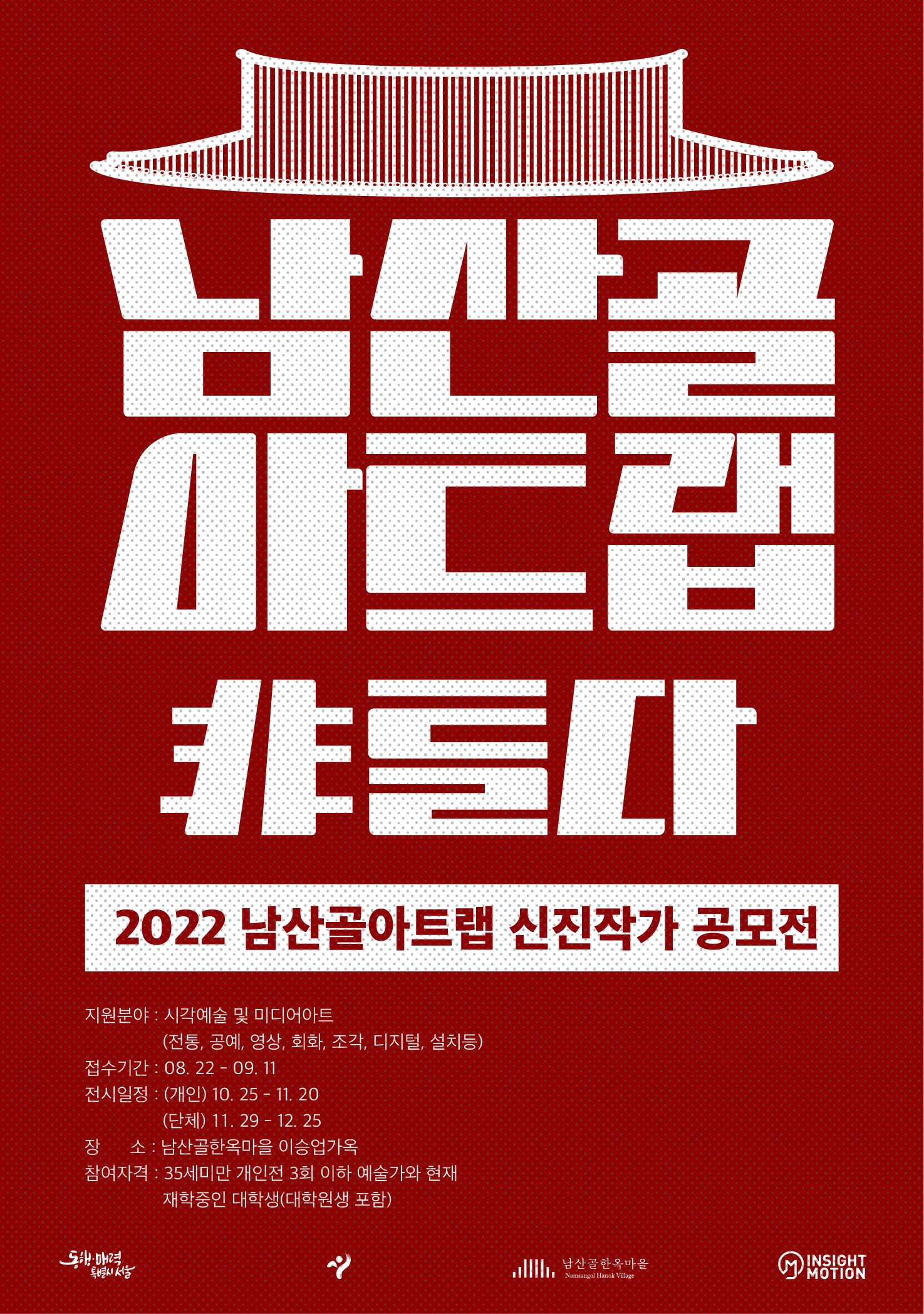 □ 개요 - 공고기간 : 2022. 8. 18(목) ~ 9. 11(일) - 주최/주관: 서울시, 남산골한옥마을, ㈜인사이트모션 - 공 모 명 : 2022 남산골한옥마을 하반기 전시공모사업 남산골아트랩 - 모집기간 : 2022. 8. 22(월) ~ 9. 11(일) 22:00 도착분에 한함 - 선정규모 : 개인 1팀, 단체 1팀 총 2팀 - 전시일정 (개인) 10.25(화) ~ 11.20(일) (단체) 11.29(화) ~ 12.25(일) - 공모대상 1) 주최측이 제시하는 신진작가의 기준에 부합하는 예술가 개인 : 35세미만 개인전 3회 이하 예술가와 현재 재학중인 대학생(대학원생 포함) 단체 : 개인 기준에 부합하는 대상자가 2인 이상으로 공동전시가 가능한자 2) 공모 접수 마감일 기준 미공개 신규 창작 작품의 비중(60%) 이상 전시 가능한 예술가 3) 전통가옥 공간을 활용하여 창의적인 전시가 가능한 자 - 공모분야 : 시각예술 및 미디어아트(전통, 공예, 영상, 회화, 조각, 디지털, 설치등)