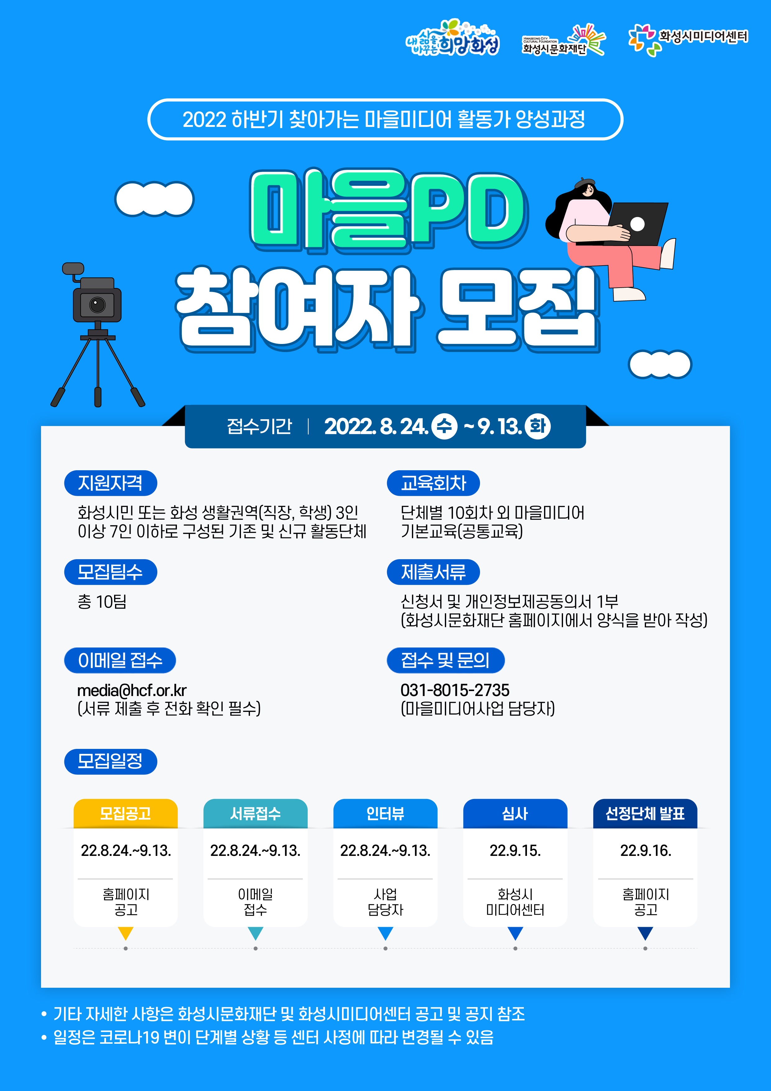 1. 모집개요 ○ 모 집 명 : 하반기 마을미디어활동가 양성과정 「마을PD」 참여자 모집 ○ 지원자격 : 화성시민 또는 화성 생활권역(직장, 학생) 3인 이상 7인 이하 로 구성된 기존 및 신규 활동단체 ○ 모집팀수 : 총 10팀 ○ 권역구분 - 동부 : 동탄1~8, 병점1~2, 진안동, 화산동, 기배동, 반월동, 봉담읍, 정남면 - 서부 : 남양읍, 마도면, 서신면, 송산면, 비봉면, 매송면, 새솔동 - 남부 : 향남읍, 우정읍, 팔탄면, 양감면, 장안면 ○ 교육회차 : 단체별 10회차 외 마을미디어 기본교육(공통교육) ○ 교육내용 : 미디어 영상(유튜브) 제작교육, 라디오 제작, 신문 등 운영 ○ 교육장소 : 마을미디어 학습 및 제작예정 공간 ○ 모집방법 : 공고문 서식 작성 후 담당자 이메일 접수 ○ 선정방법 : 단체별 방문 인터뷰 진행 및 지원서류 적격여부