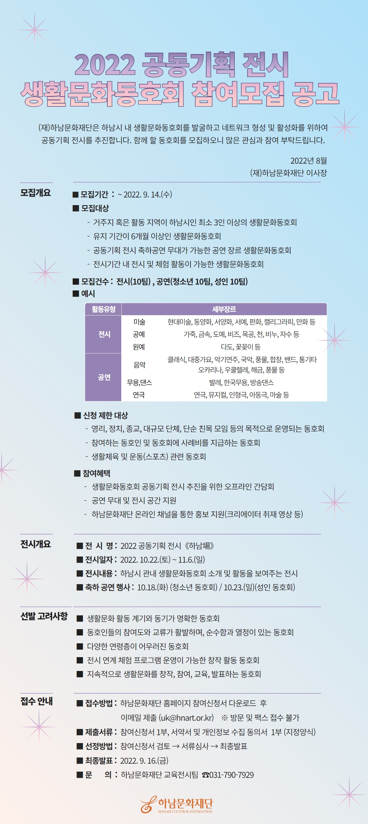 | 분야·대상 | 거주지 혹은 활동 지역이 하남시인 최소 3인 이상의 생활문화동호회 | 인원 | - |