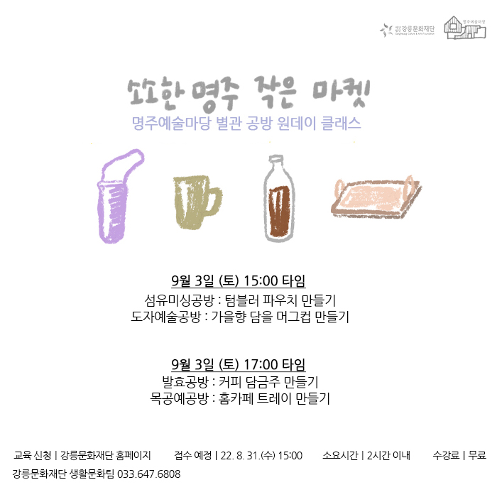 | - | 전화번호 | 강릉문화재단 생활문화팀 033-647-6808 / 담당자 직통 070-4469-8529 | |
