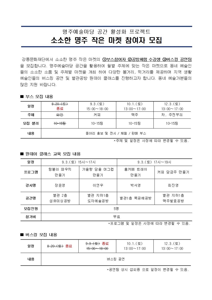 | 2022 소소한 명주 작은 마켓 참여자 모집 ( ①부스참여자 ②공방체험 수강생 ③버스킹 공연팀 모집 ) | |||