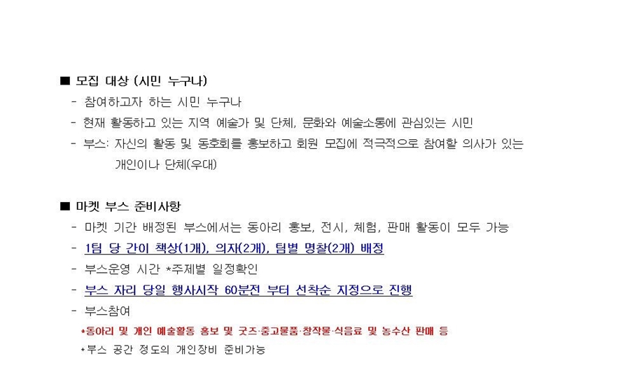 | 분야·대상 | ①부스참여자 ②공방체험 수강생 ③버스킹 공연팀 / 참여하고자 하는 시민 누구나 | 인원 | - |