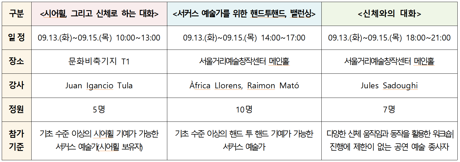 (서커스 페스티벌 연계) 3개의 워크숍 프로그램 참가자 공개모집을 시작합니다.