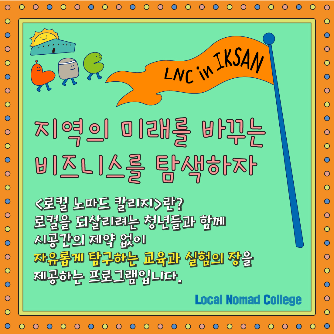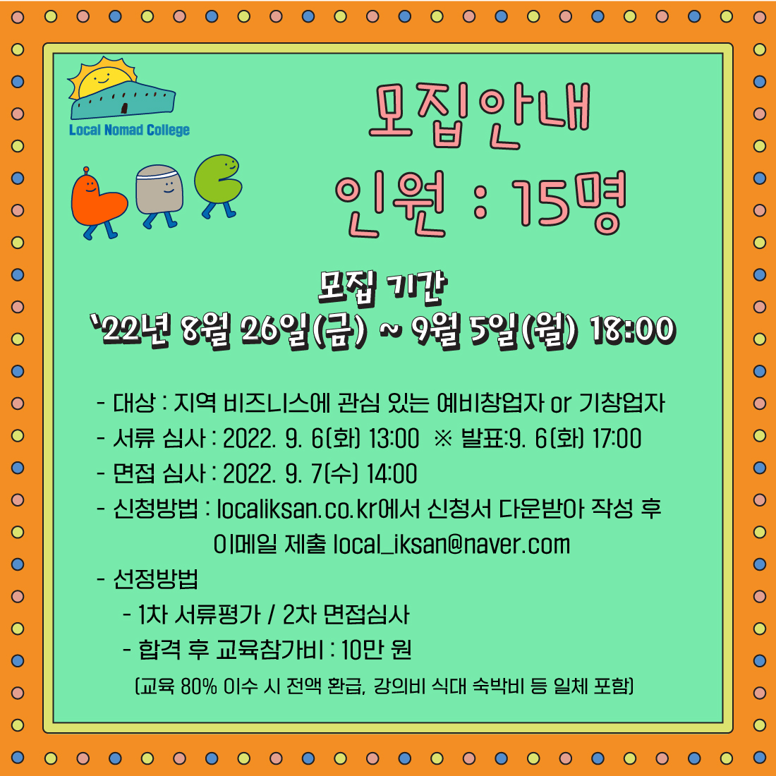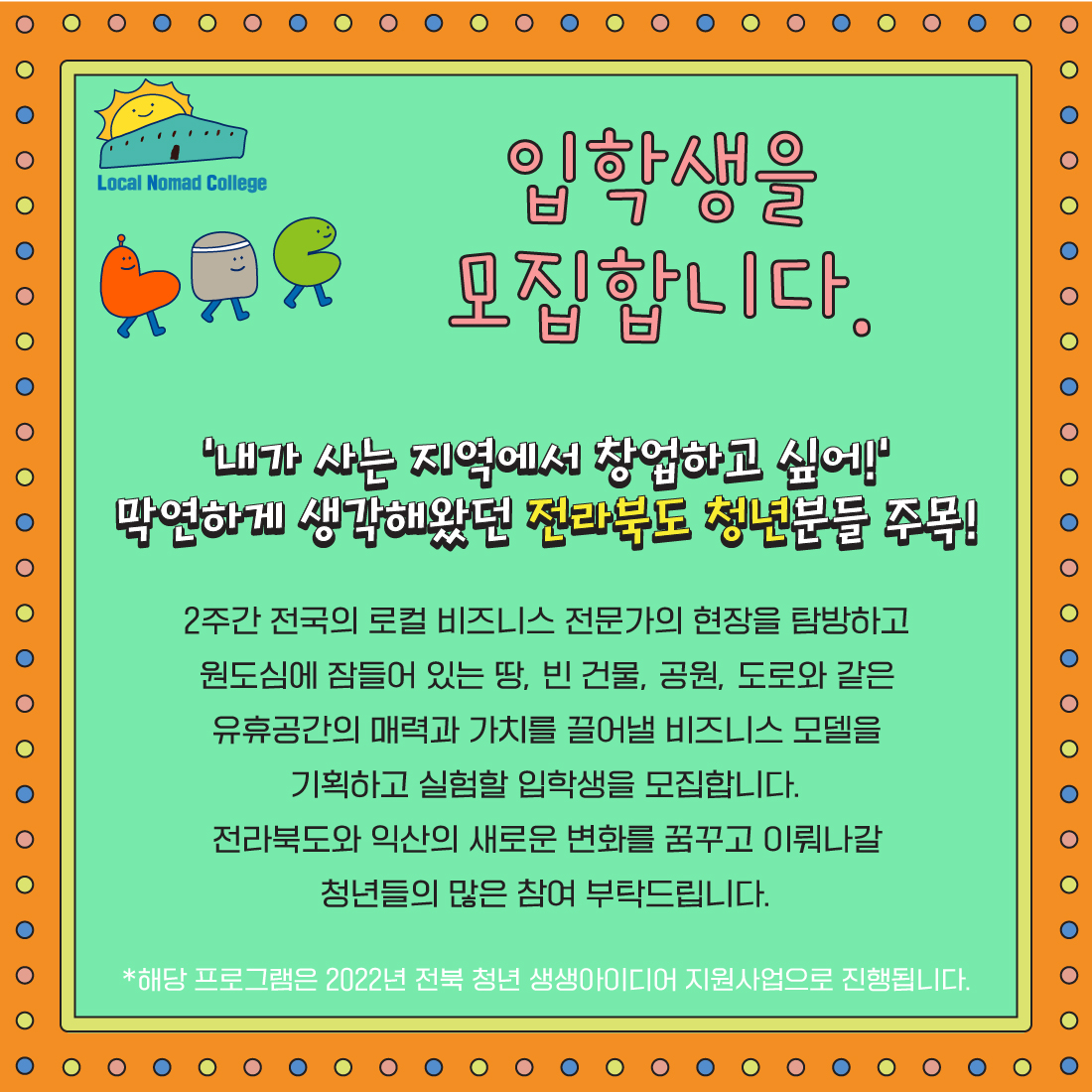 품격사회 협동조합은 지역에서 다양한 비즈니스가 만들어지고, 창업자가 전문성을 가지며 정착할 수 있도록 로컬 노마드 칼리지를 열고, 위 교육에 참여를 희망하는 입학생을 다음과 같이 모집합니다. “지역의 미래를 바꾸는 비즈니스를 탐색하자” 로컬 노마드 칼리지 in 익산 입학생을 모집합니다. ‘내가 사는 지역에서 창업하고 싶어!’ 막연하게 생각해왔던 전라북도 청년분들 주목! 지역을 중심으로 비즈니스를 경험한 선도사례를 직접 탐방하고 익산의 원도심에서 치열하게 고민하는 <로컬 노마드 칼리지>가 익산에서 개최됩니다. <로컬 노마드 칼리지>란? 로컬을 되살리려는 청년들과 함께 시공간의 제약 없이 자유롭게 탐구하는 교육과 실험의 장을 제공하는 프로그램입니다. 전국의 로컬 비즈니스 전문가의 현장을 탐방하고 원도심에 잠들어 있는 땅, 빈 건물, 공원, 도로와 같은 유휴공간의 매력과 가치를 끌어낼 비즈니스 모델을 기획하고 실험할 입학생을 모집합니다. 2주간 이용해 전국 현장과 익산 원도심 탐방이 이루어집니다. 전라북도와 익산의 새로운 변화를 꿈꾸고 이뤄나갈 청년들의 많은 참여 부탁드립니다. #로컬노마드컬리지 #로컬익산 #LNC *해당 프로그램은 2022년 전북 청년 생생아이디어 지원사업으로 진행됩니다. [모집 안내] - 인원 : 15명 (익산 청년 50%, 기타 전북 청년 50% 선발 예정) - 대상 : 지역 비즈니스에 관심 있는 청년 예비창업자 or 기창업자 - 운영방식 : 2주간 원도심 탐방과 전국 현장 탐방 진행 (총 6일) ① 9월 16일(금), 21일(수) : 익산 원도심 탐방 ② 9월 17~18일(1박 2일) : 군산 + 서천 탐방 ③ 9월 24~25일(1박 2일) : 인천 + 강화도 탐방 - 참가비 : 10만 원(교육 80% 이수 시 전액 환급, 강의비 식대 숙박비 등 일체 포함) - 모집 기간 : 2022년 8월 26일(금) ~ 9월 5일(월) 18:00 (휴일 포함) - [홈페이지] [오픈채팅] 참여코드 2022 https://open.kakao.com/o/giv3Xnxe