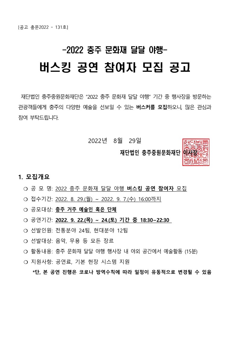 | 2022 충주 문화재 야행 버스킹 공연 참여자 모집 공고 | |||