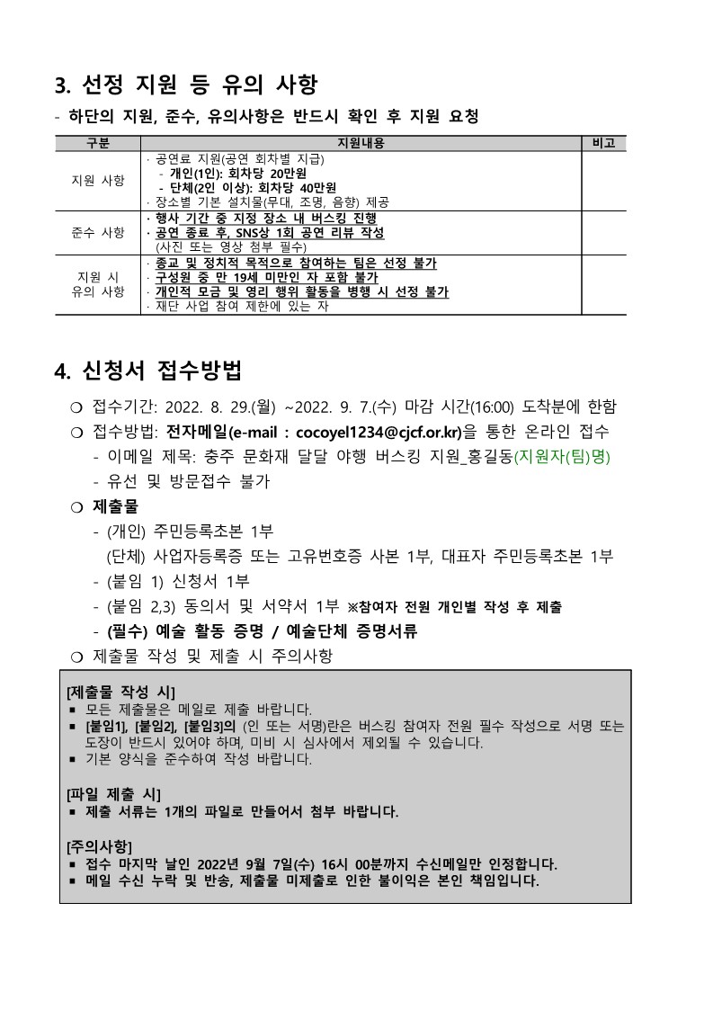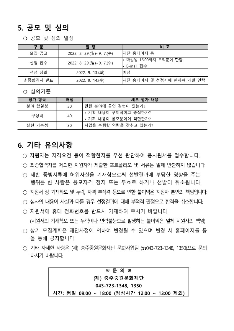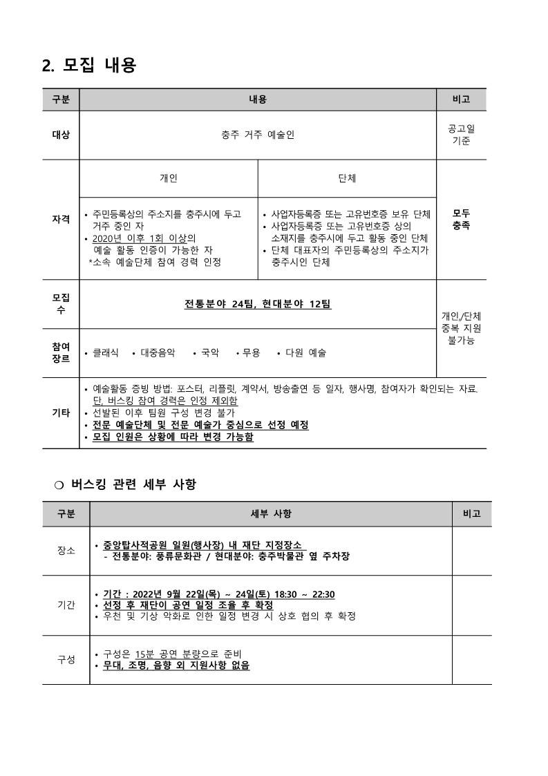 | 분야·대상 | 음악, 무용 등 모든 장르 / 충주 거주 예술인 혹은 단체 | 인원 | 전통분야 24팀, 현대분야 12팀 |
