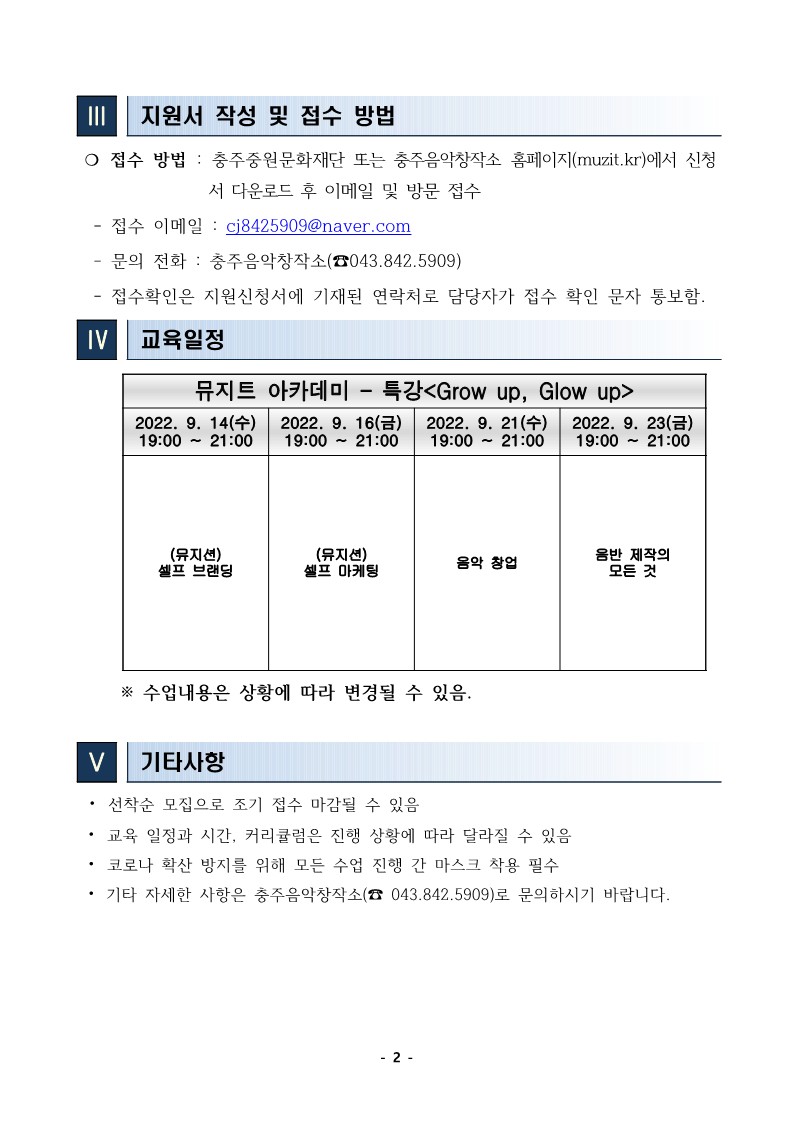 | 분야·대상 | 충북도내 거주 중인 음악인, 음악동호인, 입시생 등 | 인원 | 20명 내외 |
