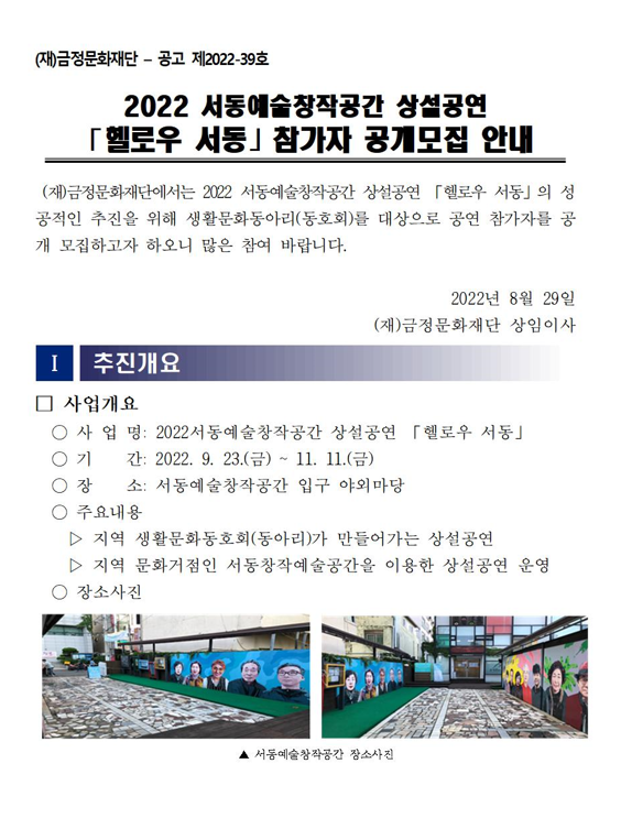 | 2022 서동예술창작공간 상설공연 <헬로우 서동> 공연 참여자 모집 공고 | |||