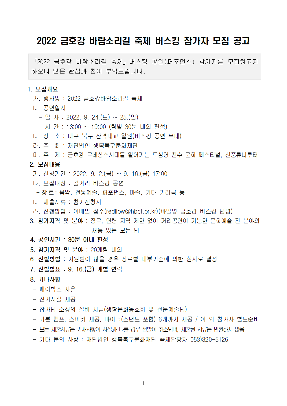 | 2022 금호강 바람소리길 축제 버스킹 참가자 모집 공고 | |||