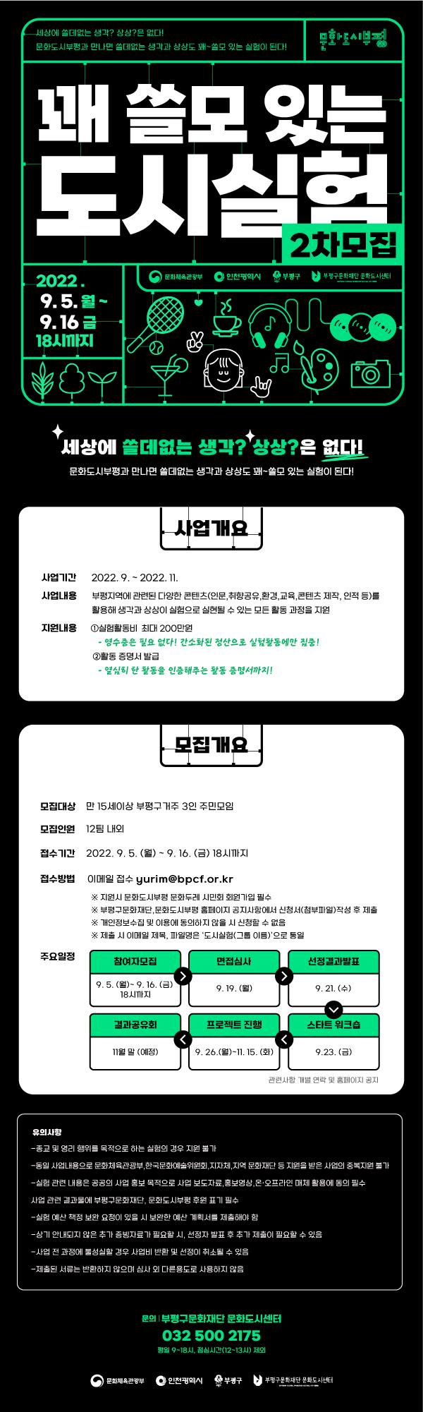 사업개요 * 사업기간 : 2022. 9. ~ 2022. 11. * 사업내용 : 부평지역에 관련된 다양한 콘텐츠(인문, 취향공유, 환경, 교육, 콘텐츠 제작, 인적 등)를 활용해 생각과 상상이 실험으로 실현될 수 있는 모든 활동 과정을 지원 * 지원내용 - 영수증은 필요 없다! 간소화된 정산으로 실험활동에만 집중! ② 활동 증명서 발급 - 열심히 한 활동을 인증해주는 활동 증명서까지! * 활동내용 - 실험활동 : 10월 1일 ~ 11월 15일 - 결과보고는 실험활동 종료 후 1주 이내 제출 - 사업운영을 위한 워크숍, 결과공유회 등 일정에 참여 및 협조 필수 모집개요 * 모집대상 : 만 15세이상 부평구거주 3인 주민모임 * 모집인원 : 12팀 내외 * 접수기간 : 2022. 9. 5. (월) ~ 9. 16. (금) 18시까지 * 접수방법 : 이메일 접수 (yurim@bpcf.or.kr) - 지원시 문화도시부평 문화두레 시민회 회원가입 필수 - 부평구문화재단, 문화도시부평 홈페이지 공지사항에서 신청서(첨부파일) 작성 후 제출 - 개인정보수집 및 이용에 동의하지 않을 시 신청할 수 없음 - 제출 시 이메일 제목, 파일명은 ‘도시실험 (그룹 이름)’으로 통일 * 주요일정 - 관련사항 개별 연락 및 홈페이지 공지