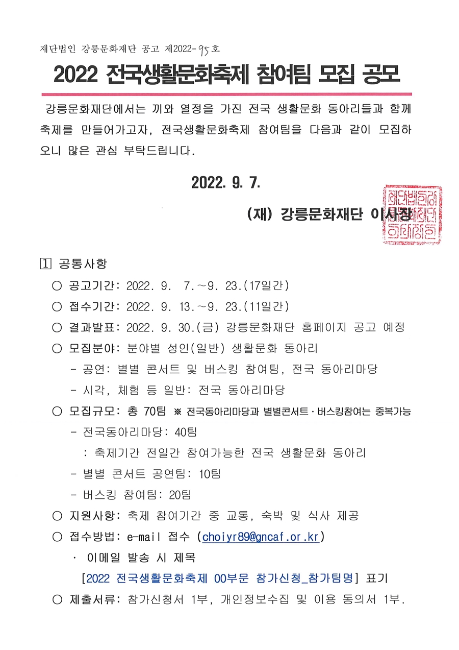 | choiyr89@gncaf.or.kr | 전화번호 | 강릉문화재단 생활문화팀 2022 전국생활문화축제사무국 033-647-6808 | |
