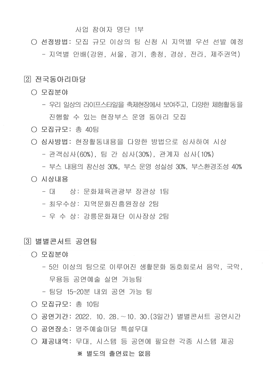 | 분야·대상 | 전국 분야별 성인(일반) 생활문화 동아리 | 인원 | 전국동아리 40팀 / 별별 콘서트 공연팀 10팀 / 버스킹 참여팀 20팀 |