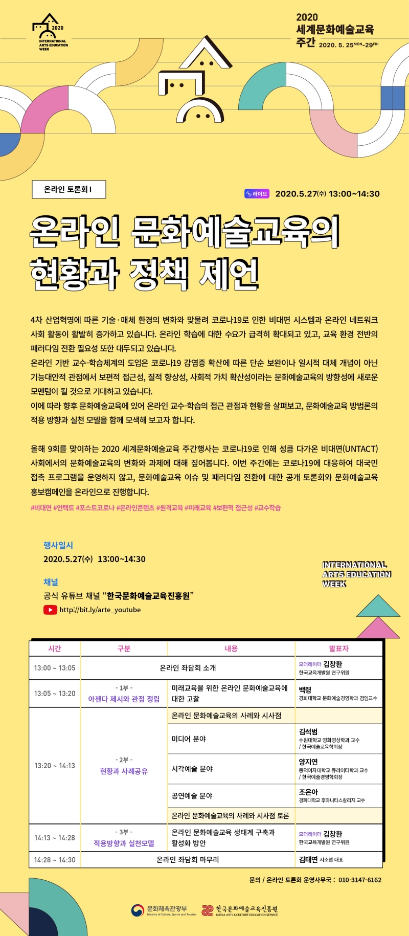 한국문화예술교육진흥원에서 오는 5월 27일과 29일에 공식 유튜브에서 세계문화예술교육 주간을 맞이하여 온라인 토론회를 개최합니다. 양일간 온라인 문화예술교육의 현황과 정책과 한국 문화예술교육에 대한 제언을 담은 대담이 이어질 예정입니다. 관심있는 분들의 많은 관람 바랍니다.