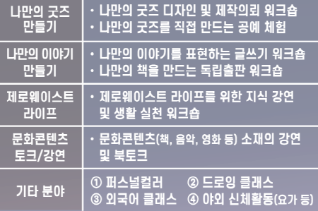 2022년 하반기에는 프로그램 기획에 앞서 시민의 관심사 의견 수렴을 위한 사전 설문조사를 진행하였으며, 설문결과를 반영한 ‘취향강좌’를 운영하고자 함에 따라 강좌 운영에 함께할 분야별 강사를 모집합니다.