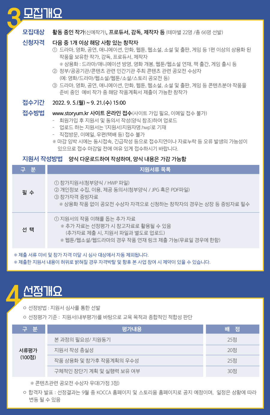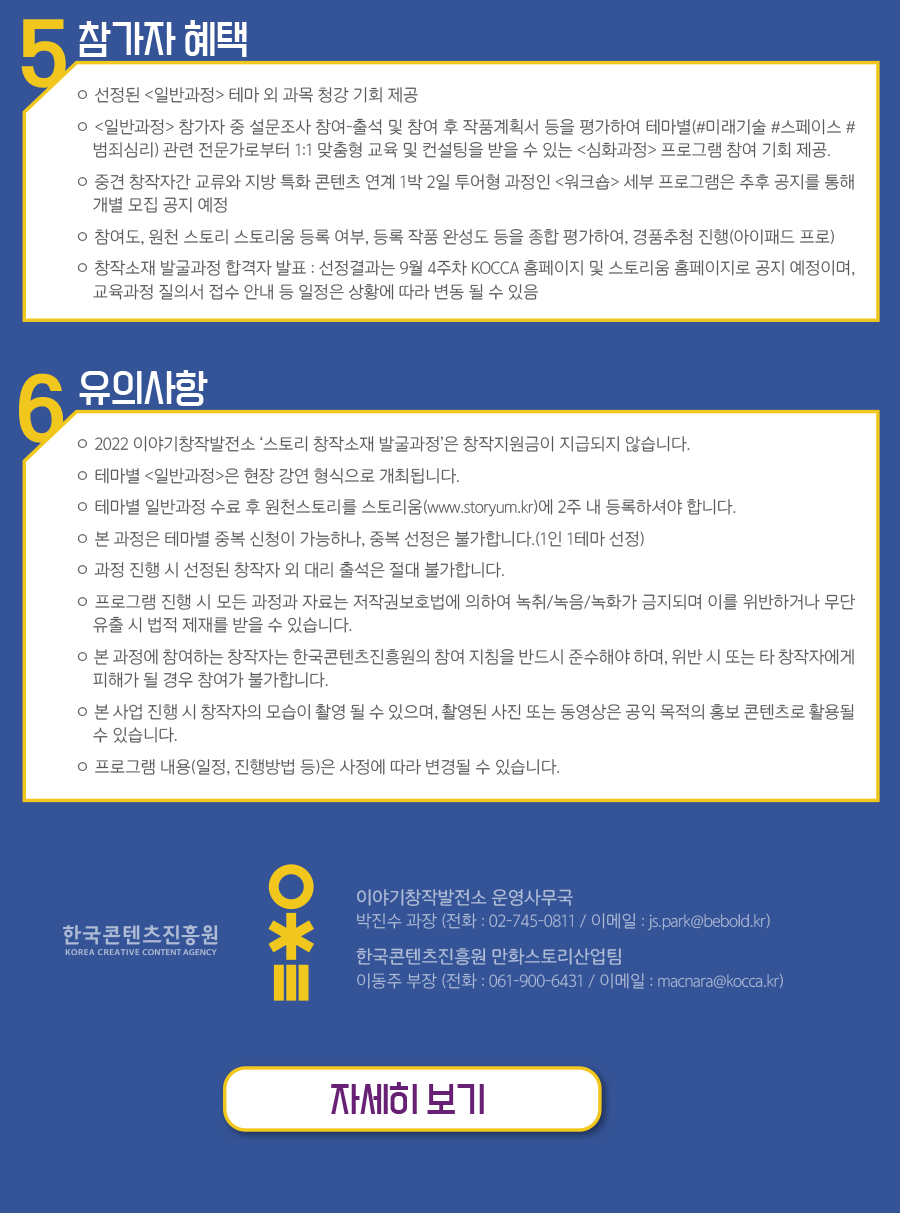 | 이야기창작발전소 운영사무국 js.park@bebold.kr / 한국콘텐츠진흥원 만화스토리산업팀 macnara@kocca.kr | 전화번호 | 이야기창작발전소 운영사무국 02-745-0811 / 한국콘텐츠진흥원 만화스토리산업팀 061-900-6431 | |