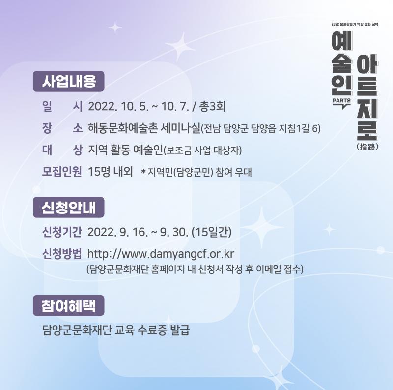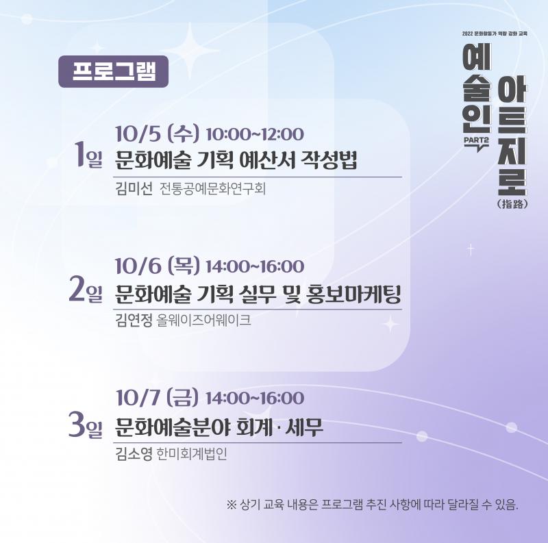 | 분야·대상 | 지역 활동 예술인 (보조금 사업 대상자) | 인원 | 15명 내외 |