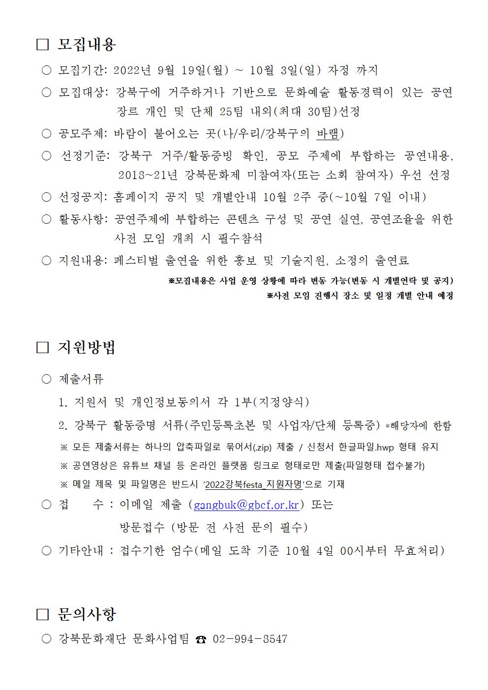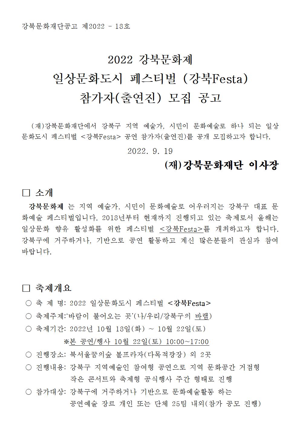 | 2022 강북문화제 l 일상문화도시페스티벌 [강북Festa] 참가자(출연진) 모집공고(~10/3) | |||