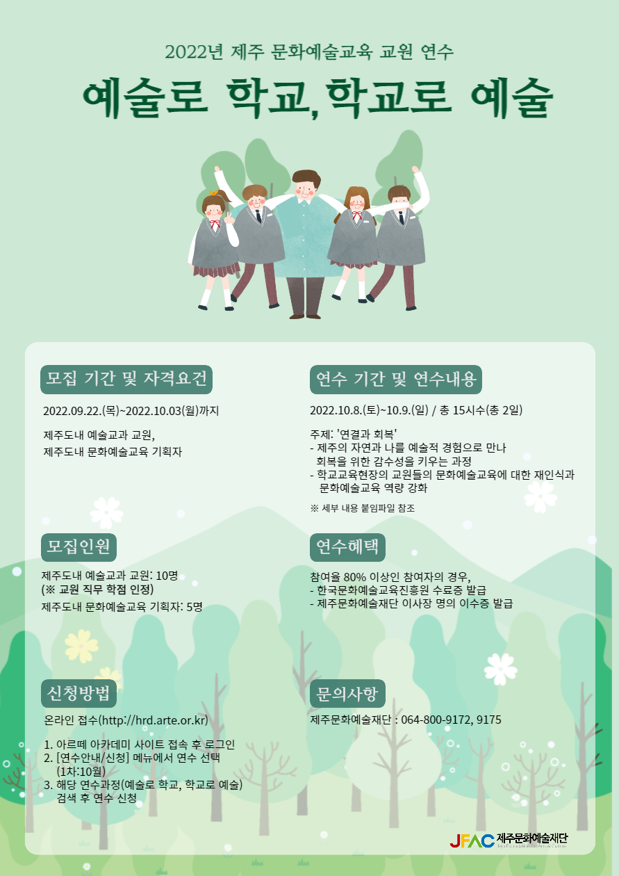 | 2022년 제주 문화예술교육 교원 연수 <예술로 학교, 학교로 예술> 1차 참여자 모집 안내 | |||