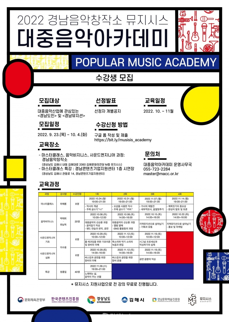 | master@macc.or.kr | 전화번호 | 대중음악아카데미 운영사무국 055-723-2284 | |