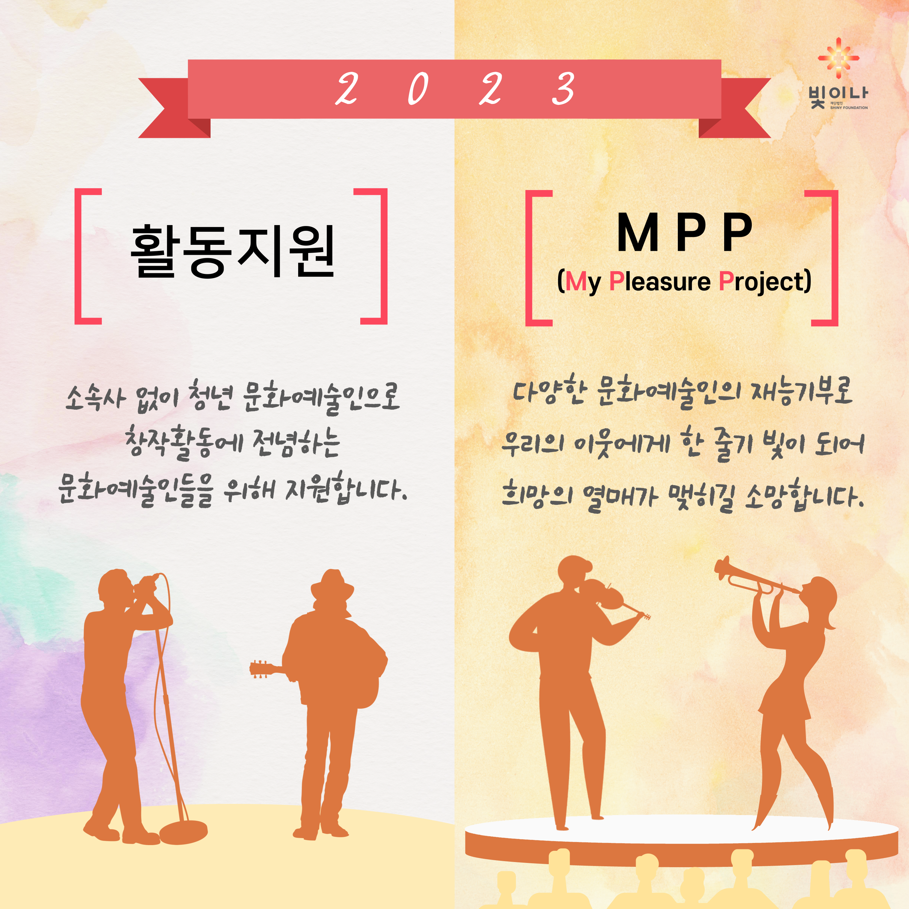 1. 사업목적 「문화·예술활동 지원사업」은 소속사 없이 청년 문화예술인으로 창작활동에 전념하는 문화예술인들을 위해 지원하는 사업입니다. 문화·예술활동 이력 및 향후 활동계획을 중점으로 심사하여 선정된 개인 또는 팀에게 활동비를 지원합니다.