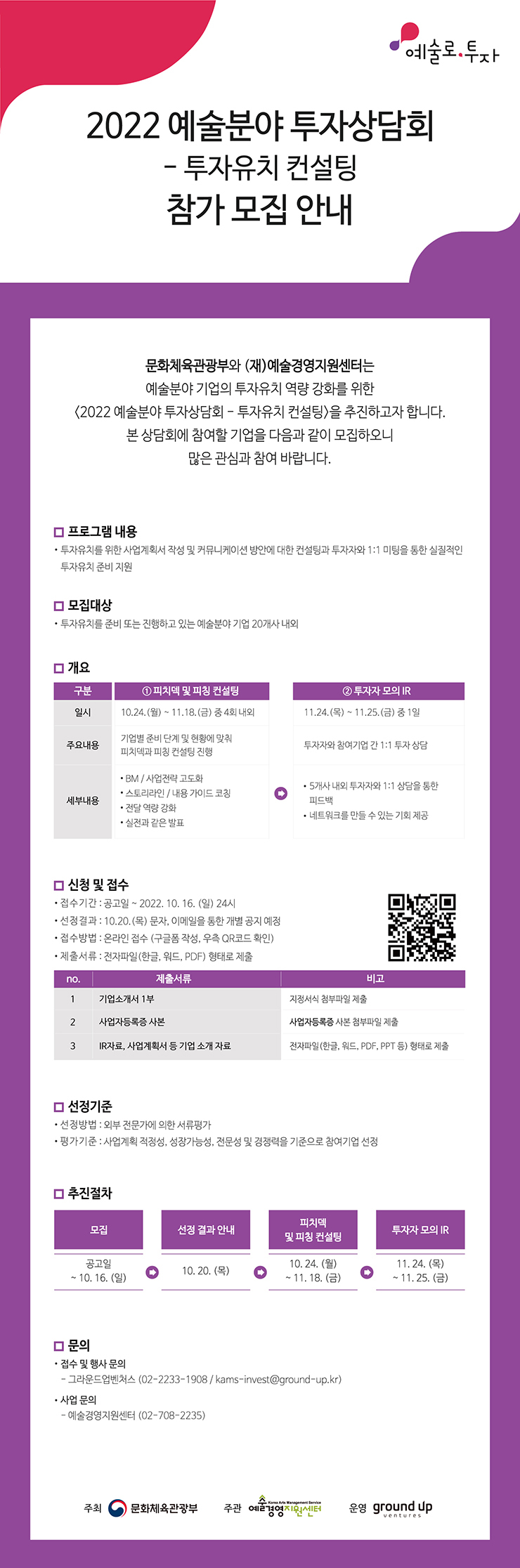 | kams-invest@ground-up.kr | 전화번호 | 그라운드업벤처스 02-2233-1908 / 예술경제지원본부 기업성장지원팀 02-708-2235 | |