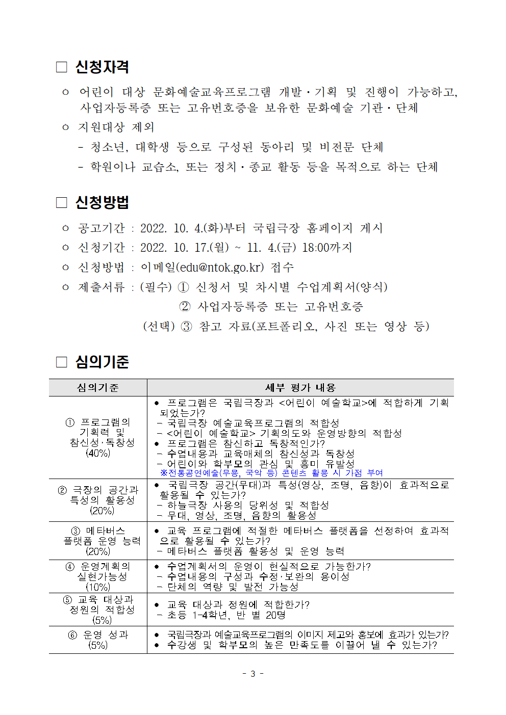 | edu@ntok.go.kr | 전화번호 | 예술교육팀 02-2280-5821 / 5823 | |
