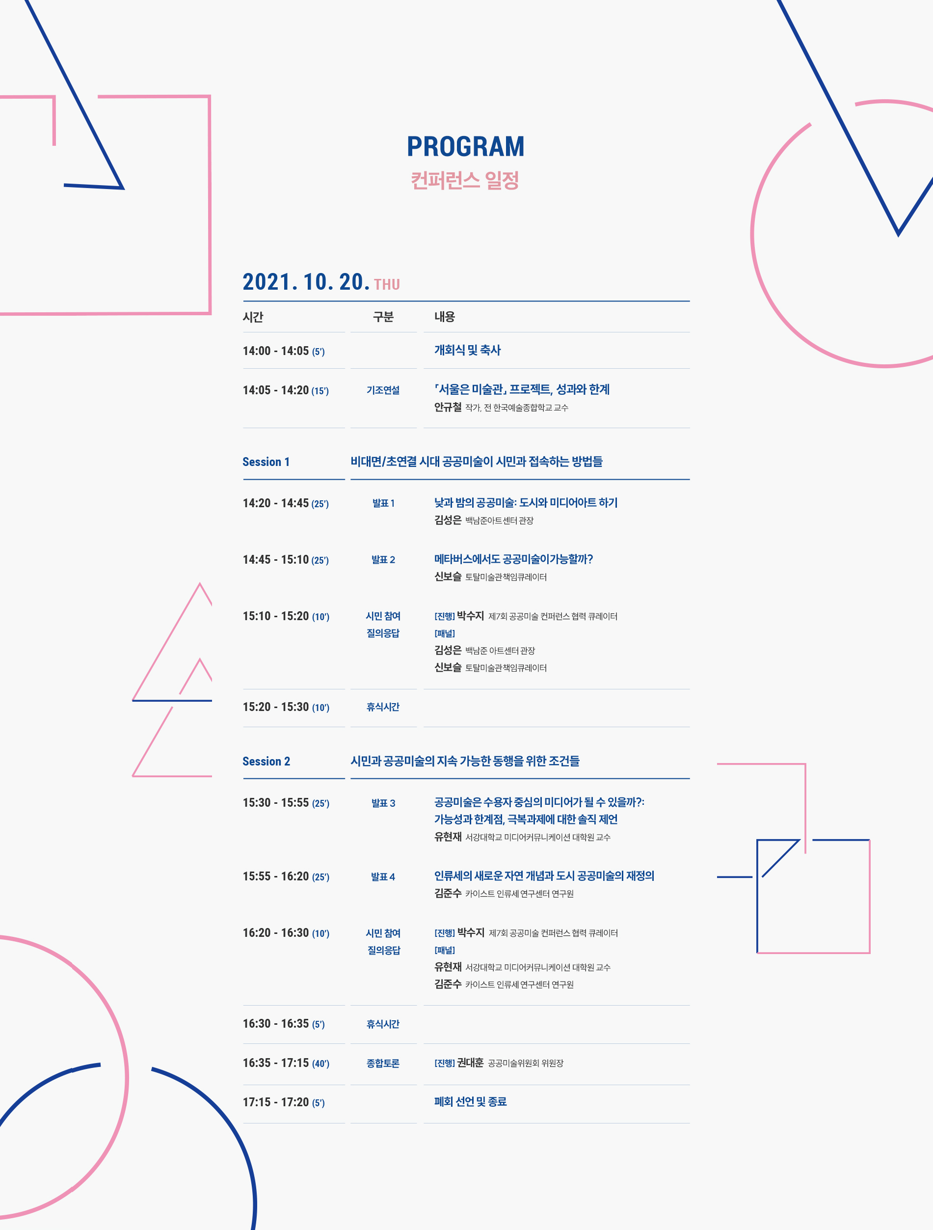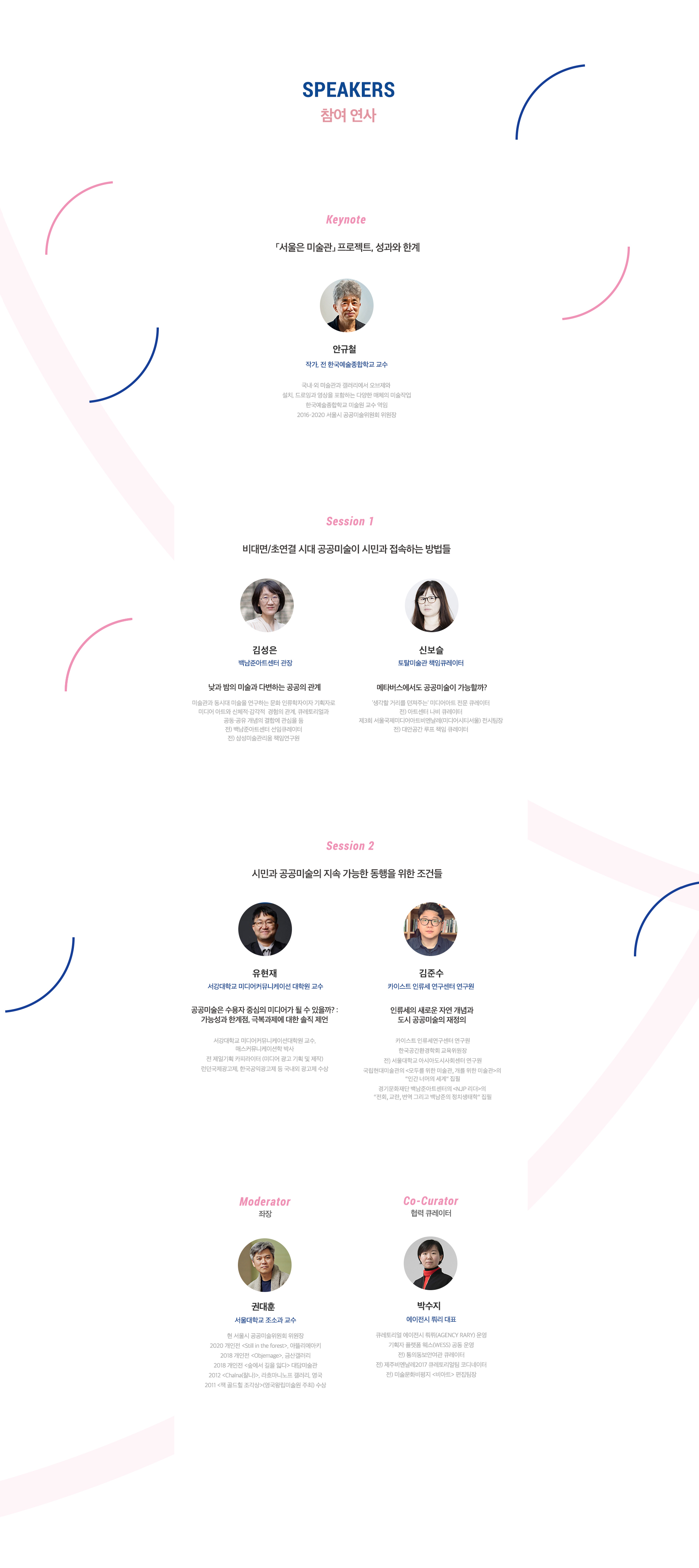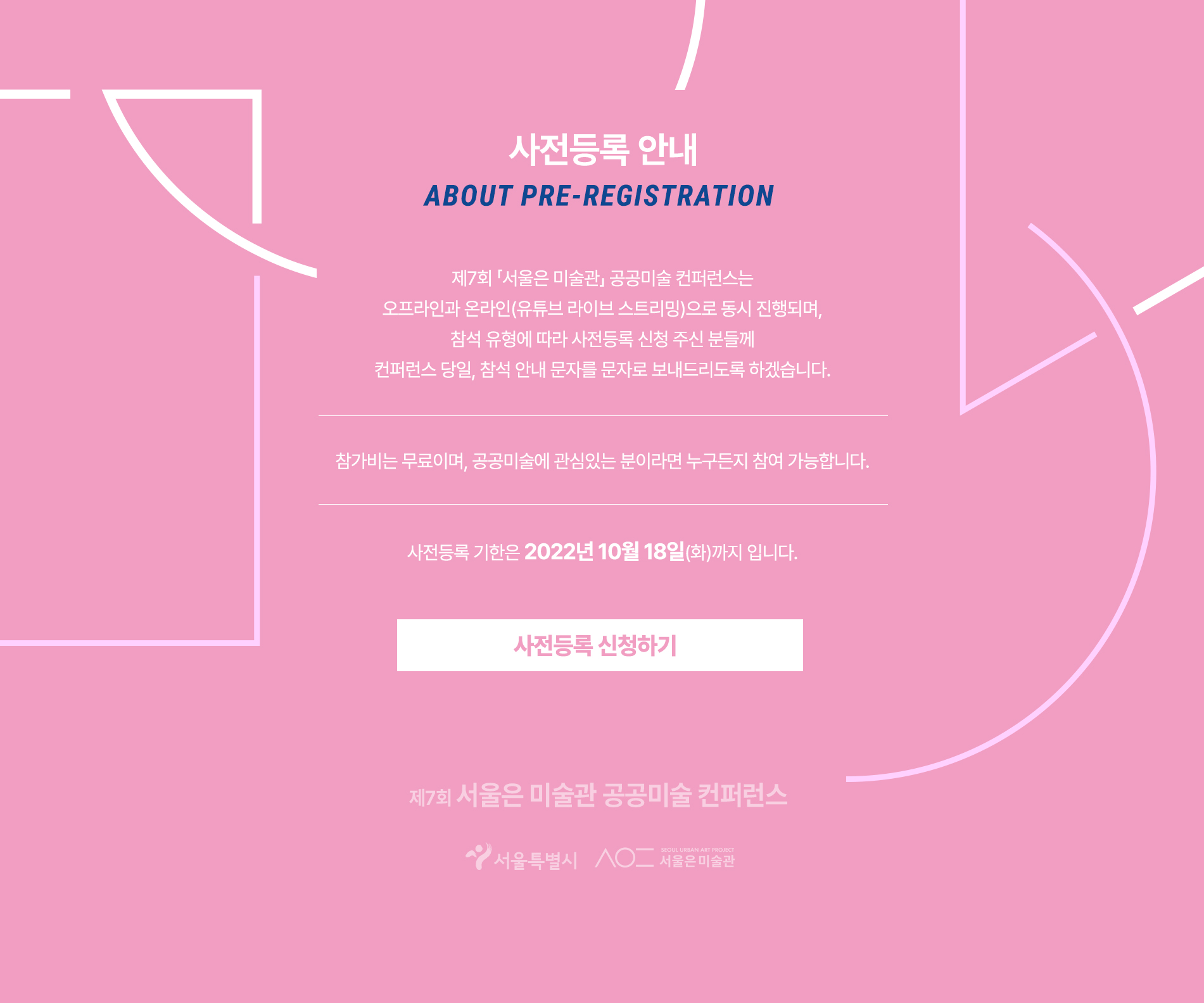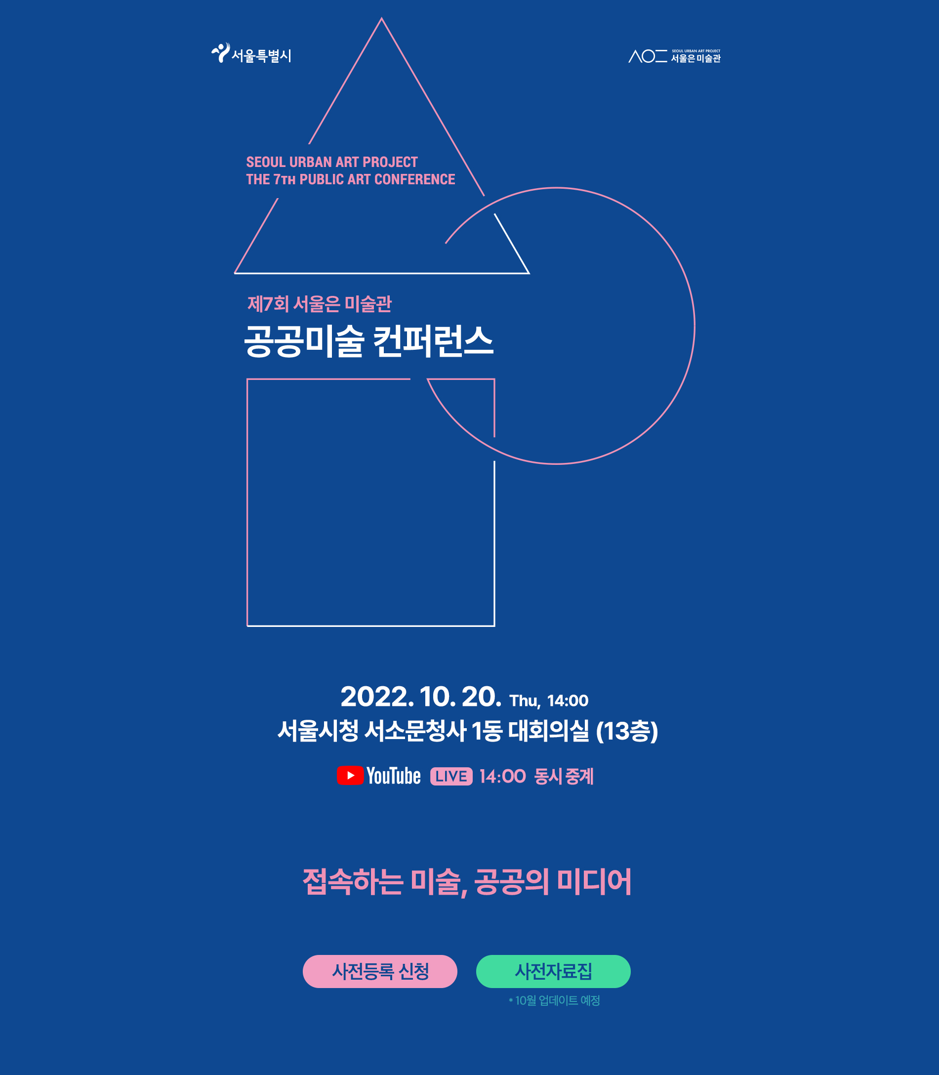 ![]() 서울시는 시민 중심의 공공미술의 철학과 비전을 제시하는 제7회 「서울은 미술관」 공공미술 컨퍼런스를 10월 20일(목) 서울시 서소문청사 1동 대회의실(13층)에서 개최합니다. 이번 컨퍼런스는 ‘접속하는 미술, 공공의 미디어’를 주제로 감염병 대유행 이후 가속화된 온라인ㆍ비대면 중심 사회에서 공공미술의 확장 가능성을 조망하고, 시민을 위한 유ㆍ무형의 미디어로서 서울시 공공미술의 방향을 모색하고자 마련되었습니다. 시대의 변화에 따른 공공미술의 현주소와 앞으로의 방향성을 모색해보는 이번 컨퍼런스에서 공공미술에 관심있는 시민분들의 많은 관심과 참여 부탁드립니다. □ 행사 개요 일시/장소 : 2022. 10. 20.(목) 14:00 / 서울시청 서소문청사 1동 대회의실(13층) 주 제 : 접속하는 미술, 공공의 미디어 □ 문의: 운영사무국(070-4467-9906), 서울시 디자인정책담당관(02-2133-2712) |