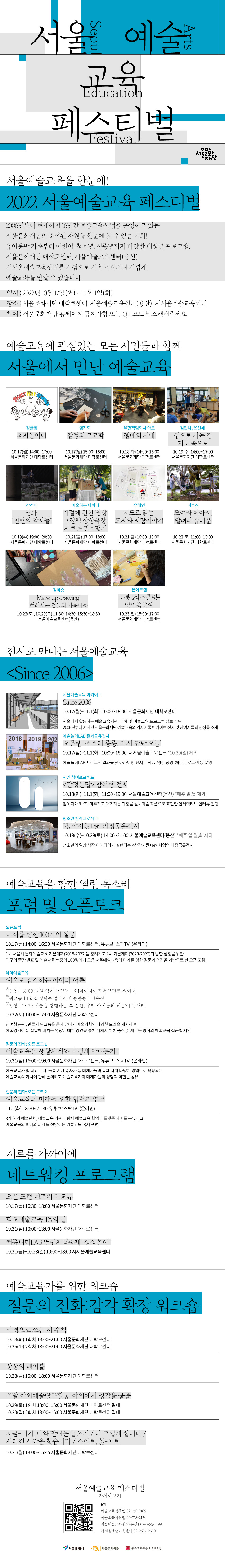 문의 - 예술교육정책팀 02-758-2105 - 예술교육지원팀 02-758-2124 - 서울예술교육센터(용산) 02-3785-3199 - 서서울예술교육센터 02-2697-2600 서울예술교육 페스티벌 참여하기 : https://linktr.ee/2022saef