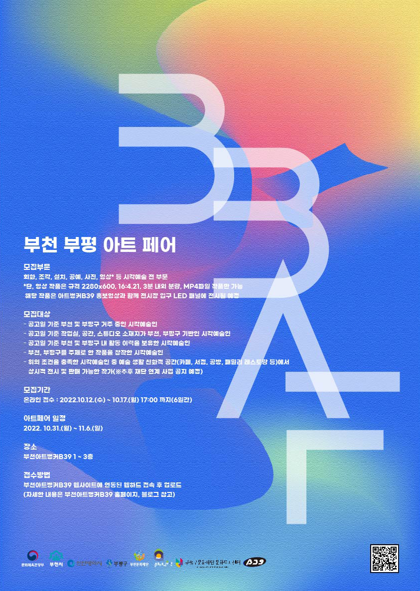 - 일 정 : 10.26.(수) ~ 27.(목) 이틀간 10:00 ~ 16:00(점심시간 12:00 ~ 13:00 제외) - 장 소 : 부천아트벙커B39 1층 서비스 스테이션으로 접수