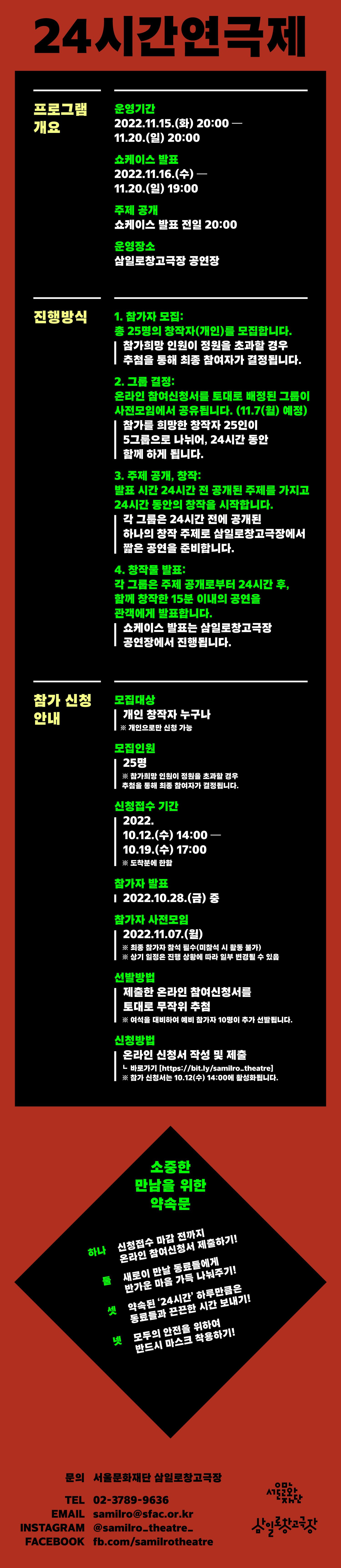 선발방법 제출한 온라인 참여신청서를 토대로 무작위 추첨 ※ 여석을 대비하여 예비 참가자 10명이 추가 선발됩니다. 신청방법 온라인 신청서 작성 및 제출 ┗ 바로가기 [ https://bit.ly/samilro_theatre ] ※ 참가 신청서는 10.12(수) 14:00에 활성화됩니다. ─ 소중한 만남을 위한 약속문 하나, 신청접수 마감 전까지 온라인 신청서 제출하기! 둘, 새로이 만날 동료들에게 반가운 마음 가득 나눠주기! 셋, 약속된 ’24시간’ 하루만큼은 동료들과 끈끈한 시간 보내기! 넷, 모두의 안전을 위하여 반드시 마스크 착용하기!