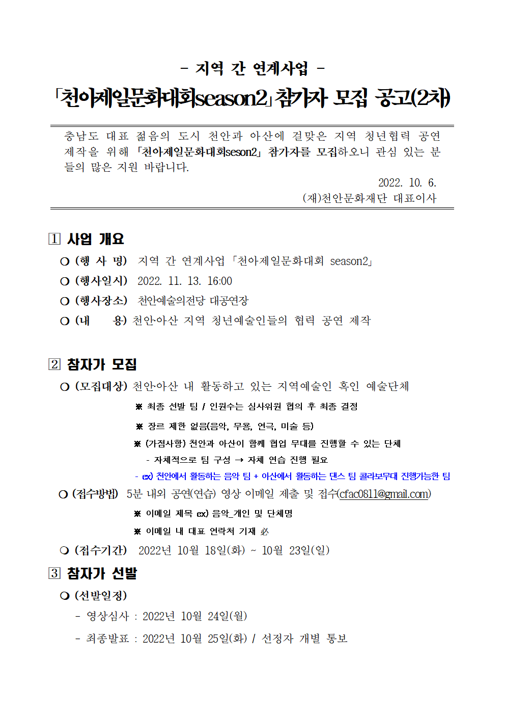 | 「천아제일문화대회season2」참가자 모집 공고(2차) | |||
