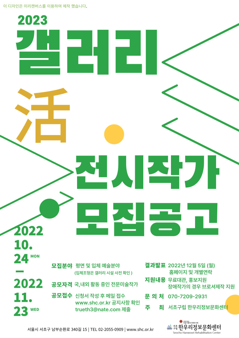 나. 최종선정안내 1) 일시 : 2022. 12. 5(월) 2) 방법 : 홈페이지 게시 후 순차적 전화 안내 / www.shc.or.kr 7. 지원자 유의사항 가. 제출 서류의 내용 중 의도적인 미기입사항이나 허위 사실이 있는 경우 선정 취소 나. 갤러리活은 문화시설이 아닌 장애인복지시설 임을 유의바람. 다. 와이어 사용하여 DP함으로 액자에 와이어끈이나 고리가 반드시 있어야 함. 라. 작품 반,출입은 전시작가 진행임. 8. 문의 서초구립한우리정보문화센터 문화직업팀 070-7209-2931 / www.shc.or.kr