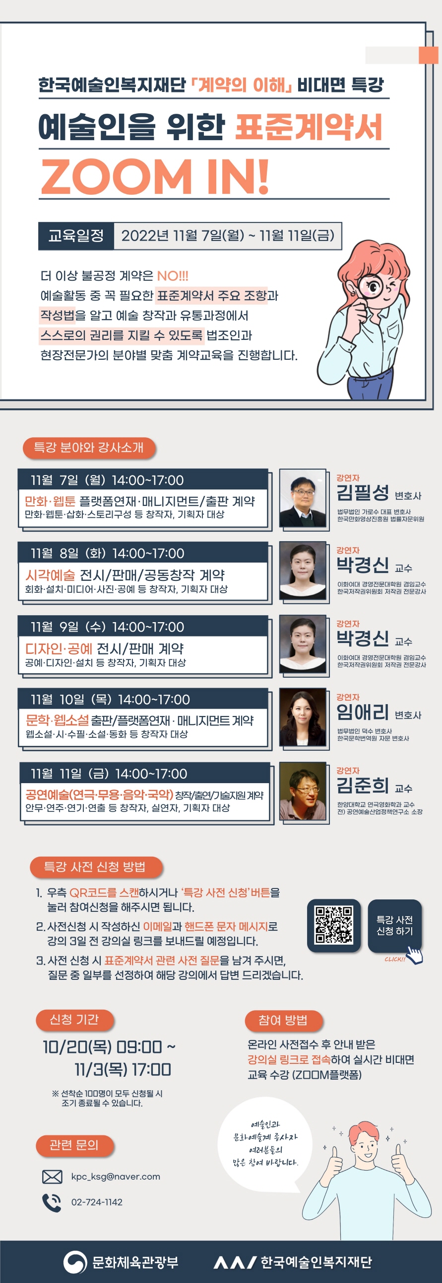 □ 교 육 명: 「예술인을 위한 계약의 이해」 표준계약서 ZOOM IN! □ 교육대상 - 예술활동을 하는 각 분야 창작자·실연자·기획자 - 예비예술인 및 문화예술기관 종사자 등 □ 교육일정: 2022년 11월 7일(월) ~ 11월 11일(금), 총 5회차 □ 교육장소: 온라인 화상회의 플랫폼 접속(ZOOM) □ 수 강 료: 무료 □ 주최·주관: 문화체육관광부·한국예술인복지재단