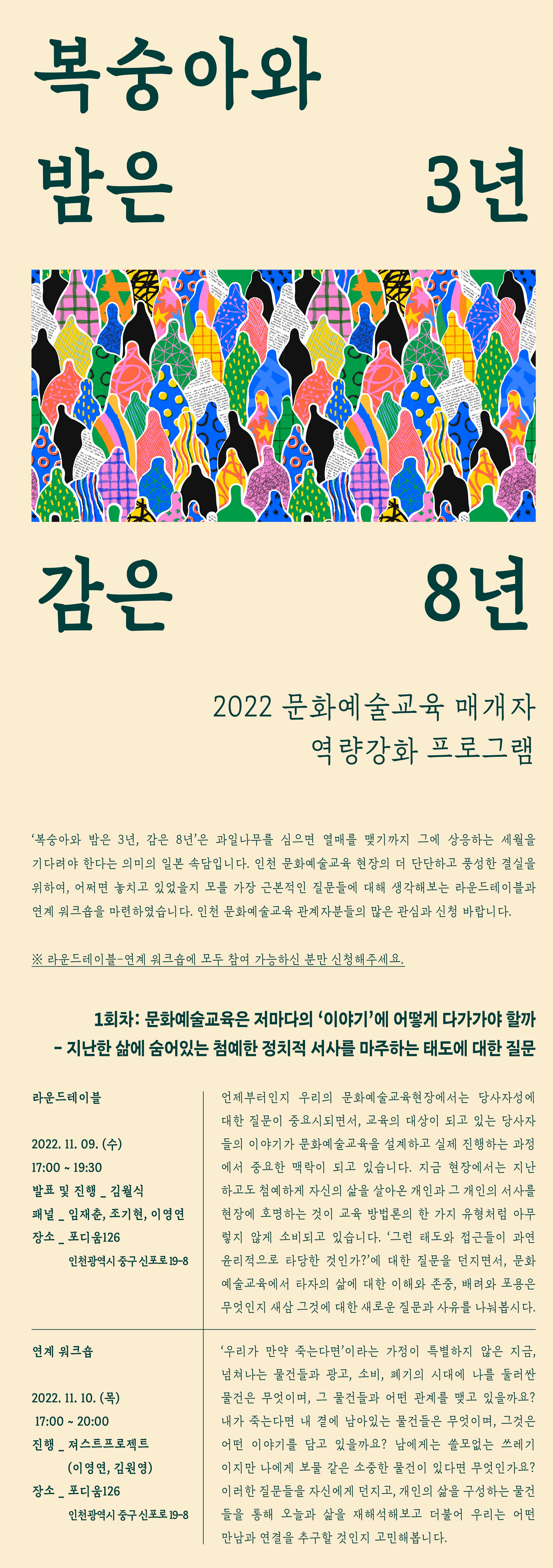 | 2022 문화예술교육 매개자 역량강화 프로그램 〈복숭아와 밤은 3년, 감은 8년〉 참여자 모집 (10. 24. ~ 마감 시까지) | |||||||||||||||||||||||
