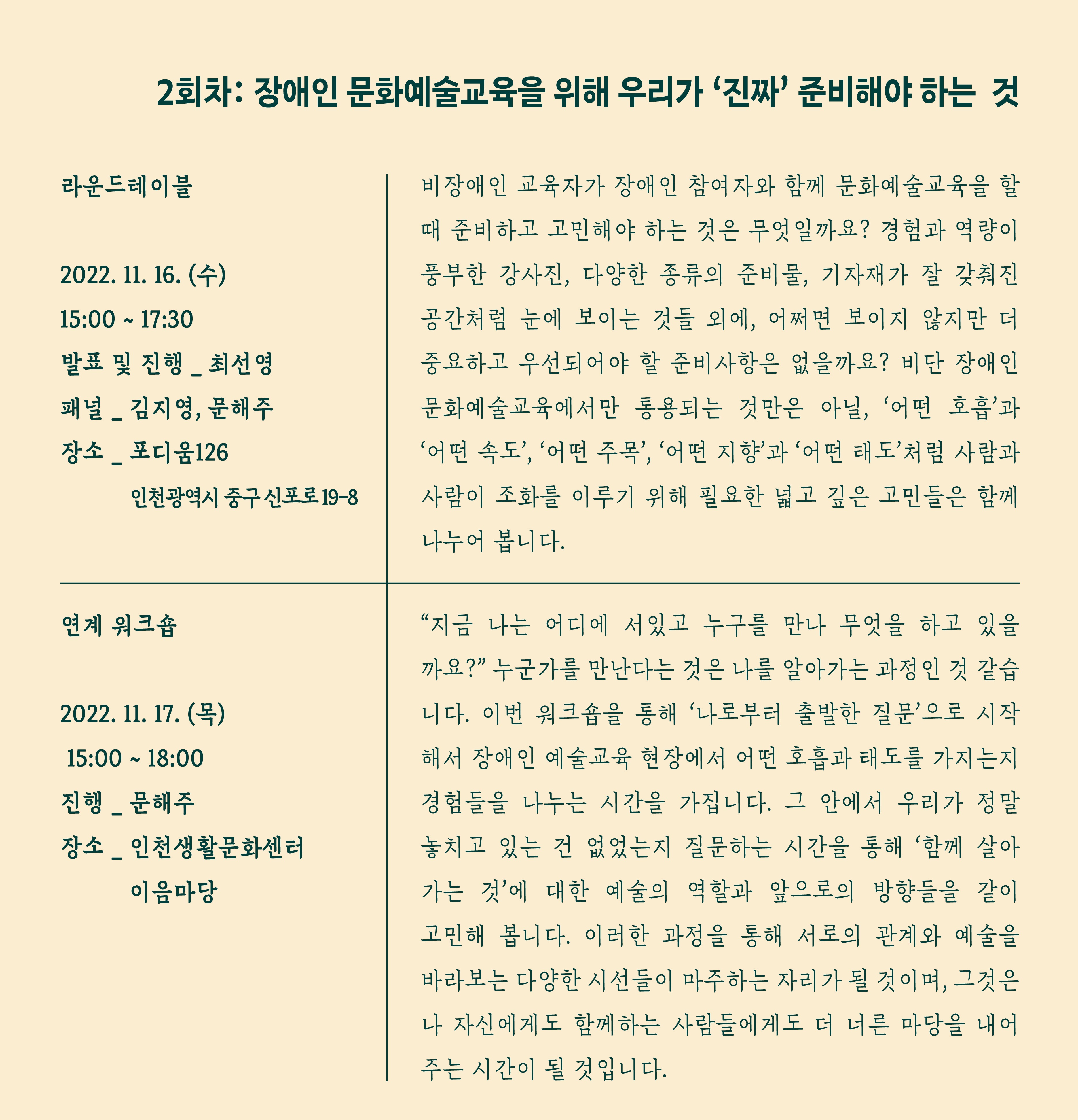 인천문화재단 인천문화예술교육센터에서 인천 문화예술교육 현장의 더 단단하고 풍성한 결실을 위하여, 어쩌면 놓치고 있었을지 모를 가장 근본적인 질문들에 대해 생각해보는 라운드테이블과 연계 워크숍을 마련하였습니다. 인천 문화예술교육 관계자분들의 많은 관심과 신청 바랍니다.