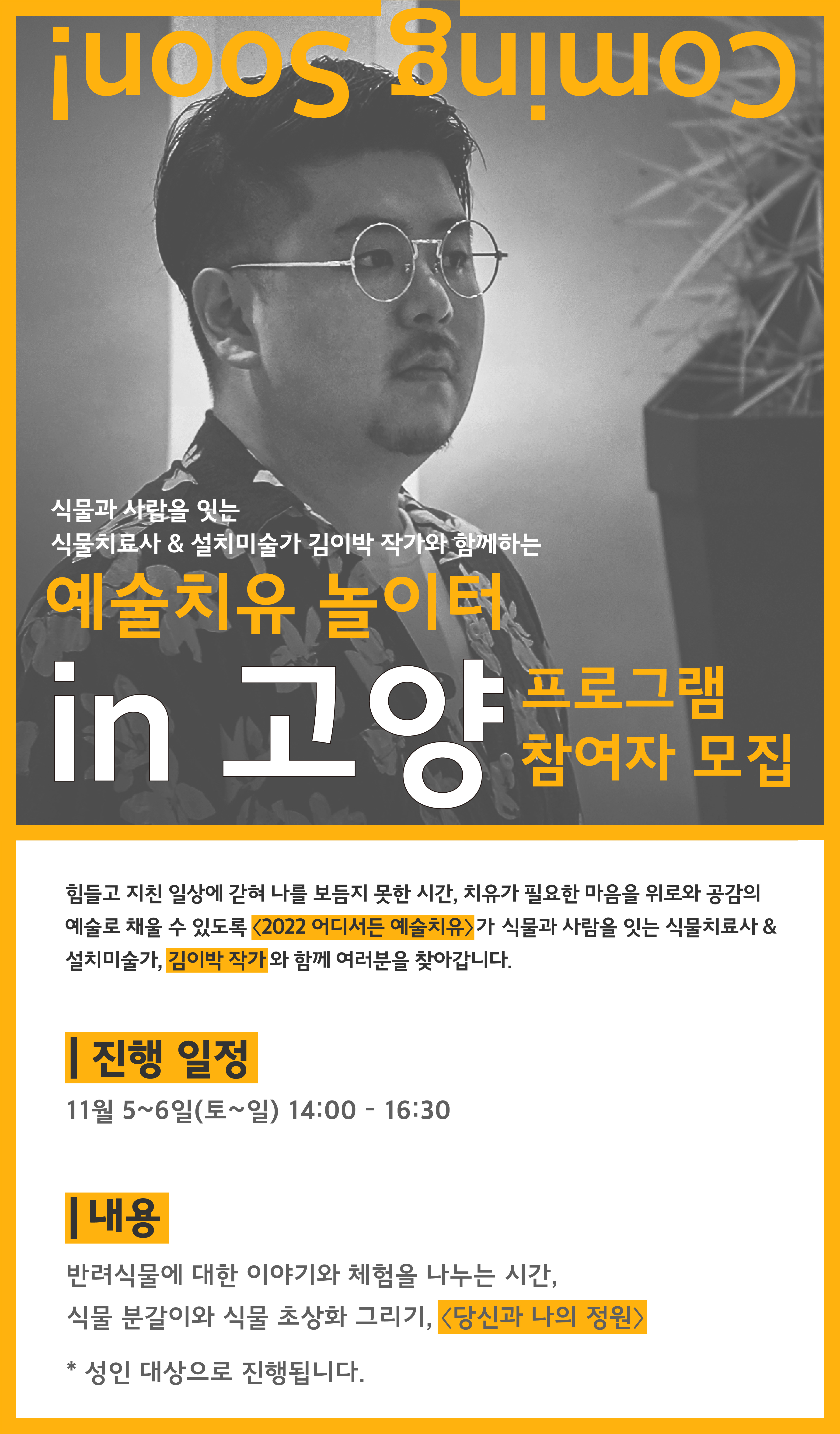2022 어디서든 예술치유 – 치유도 예술로 일상 속에서 만나는 예술공간, 도심 속 예술치유 놀이터 in 고양 소통형 프로젝트, 여덟번째! 반려식물에 대한 이야기와 체험을 나누는 시간, 식물 분갈이와 식물 초상화 그리는 '당신과 나의 정원' 프로그램 <2022 어디서든 예술치유>가, 식물과 사람을 잇는 식물치료사 & 설치미술가 김이박 작가와 함께 고양 일산을 찾아갑니다. ■ 진행 일정: 1회차 11월 5일(토) 14:00~16:30 / 2회차 11월 6일(일) 14:00~16:30 ■ 신청 방법: 김이박 작가와 함께하는 '당신과 나의 정원' 신청 폼 작성 https://naver.me/x9c2VyAr ■ 신청 기간: ~11월 4일(금) 까지 (* 상황에 따라 조기 마감될 수 있습니다.) ■ 선정자 발표: 11월 1일(화) ~ 11월 4일(금) 중, 선정자 개별 통지