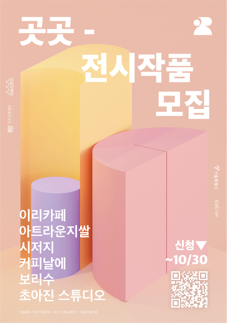 예술순환로 <곳곳>에서 11월 전시 작품을 모집합니다 @@@곳곳 11월 전시 작품 모집 11월 3일 목요일까지! 연장 신청 받습니다!!@@@ 예술순환로 <곳곳> 은 지역 공간 곳곳에 예술가의 작품을 펼쳐 보이는 팝업 전시 입니다. <곳곳> 은 창작 활동은 하지만 작품을 보여 줄 기회가 부족하다는 예술가들의 니즈를 통해 출발하였습니다. 지역 내에 카페, 식당, 미용실 등 일상의 공간에 작품 전시를 통하여 지역 작가들의 작품을 소개하고, 지역 내 공간과 예술가들이 상생할 수 있는 보다 예술가들이 살아가기 좋은 동네를 만들고자 합니다. 앞으로 <곳곳>은 작품 소개 뿐 아니라 유통까지도 고민하며 활동을 확장해 가려고 합니다. 자신의 작을 소개하고, 유통하는 것에 고민이 있는 예술가분들은 <곳곳>을 신청해주세요~ ✔ 전시기간 : 2022.11.21.(월) ~ 11.30.(수) ✔ 모집대상 : 작품을 전시할 기회를 찾고자 하는 창작자 (6명) ✔ 모집일시 : 2022.10.22.(토) ~ 11.03.(목) ✔ 매칭결과 : 2022.11.05.(토) *개별연락 ✔ 신청방법 : https://forms.gle/i2Kw5NKqqbAjuGdj8 ✔ 곳곳과 함께 하는 공간 (전시 공간) 이리카페 / 카페 시저지 / 아트라운지 쌀 / 카페 보리수 / 커피날에 / 초아진 스튜디오 자세한 내용은 신청링크를 참고해주세요! ※ 지난 10월 전시가 궁금하시다면 곳곳 또는 예술순환로 인스타그램을 참고해주세요! 곳곳 인스타그램 https://instagram.com/go_t_go_t 예술순환로 인스타그램 https://instagram.com/art_soonhwanro 문의 : 02-6906-3196 / gotgot10601@gmail.com