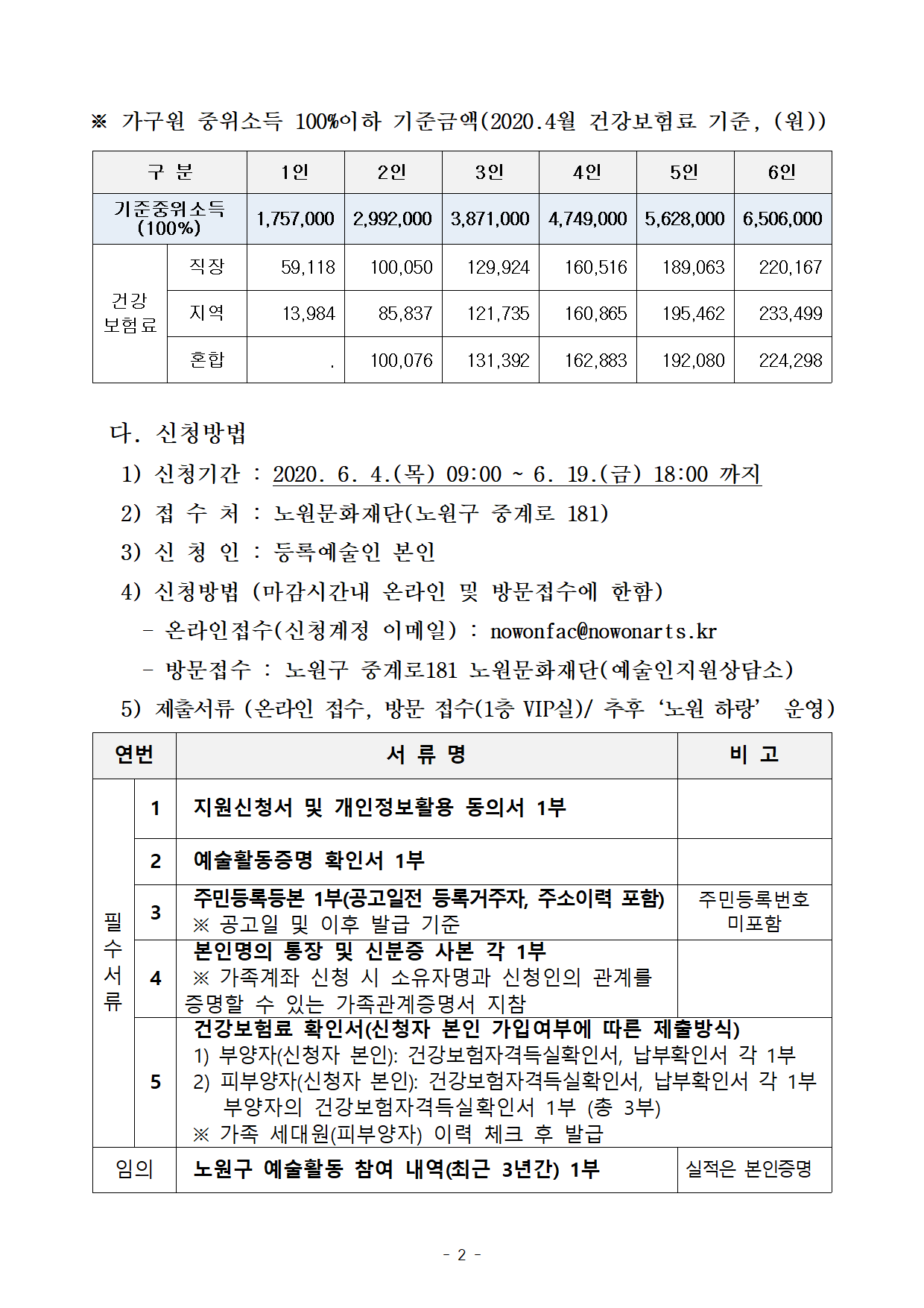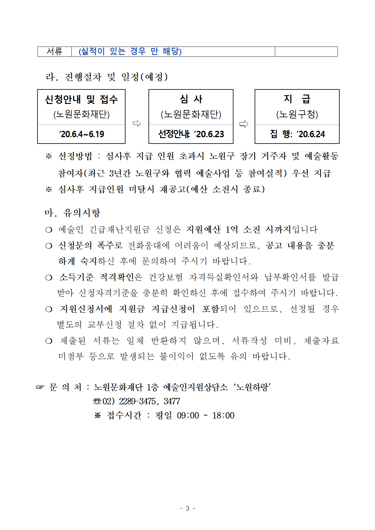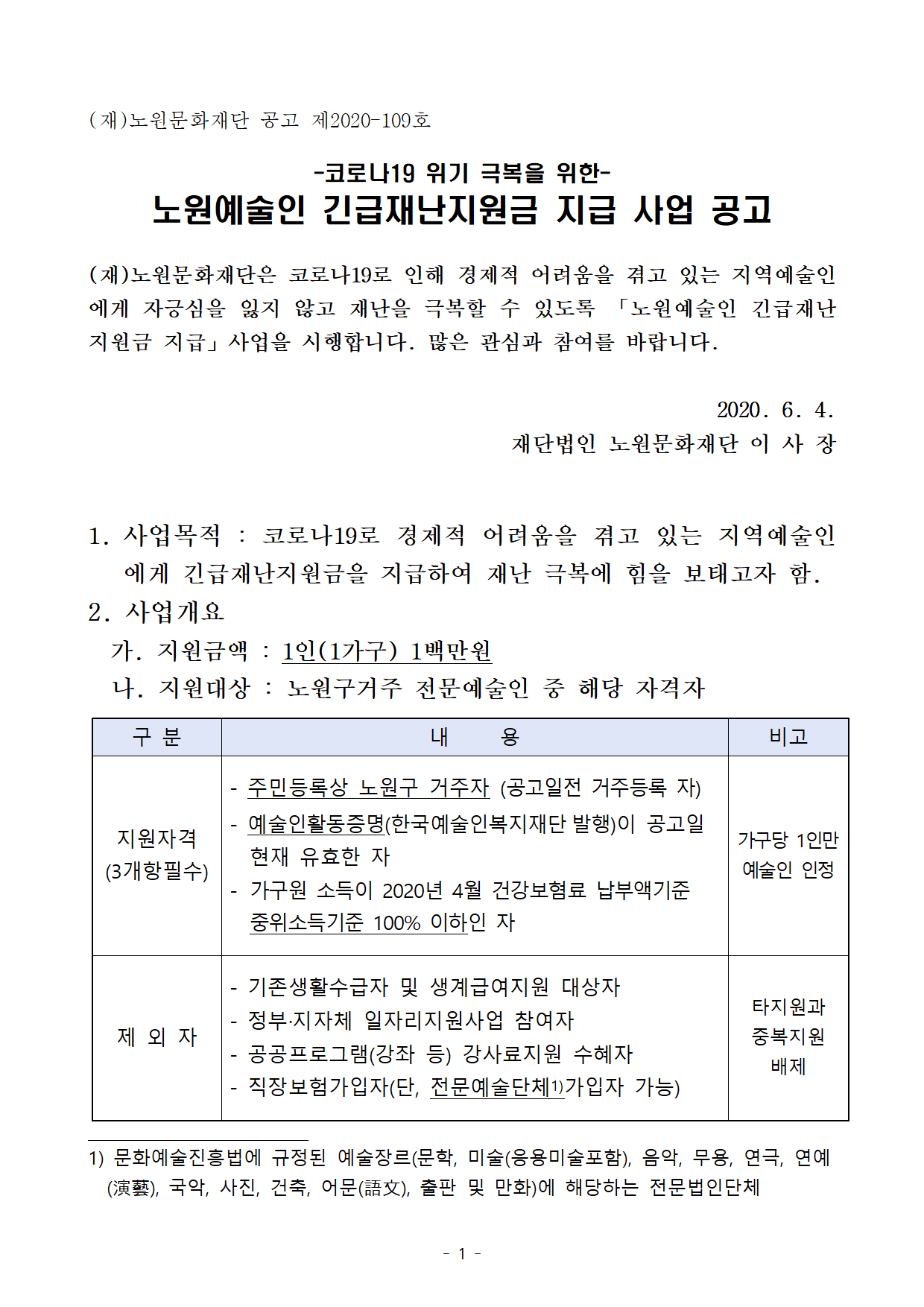 | 코로나19 위기 극복을 위한 노원예술인 긴급재난지원금 지급 사업 공고 | |||||