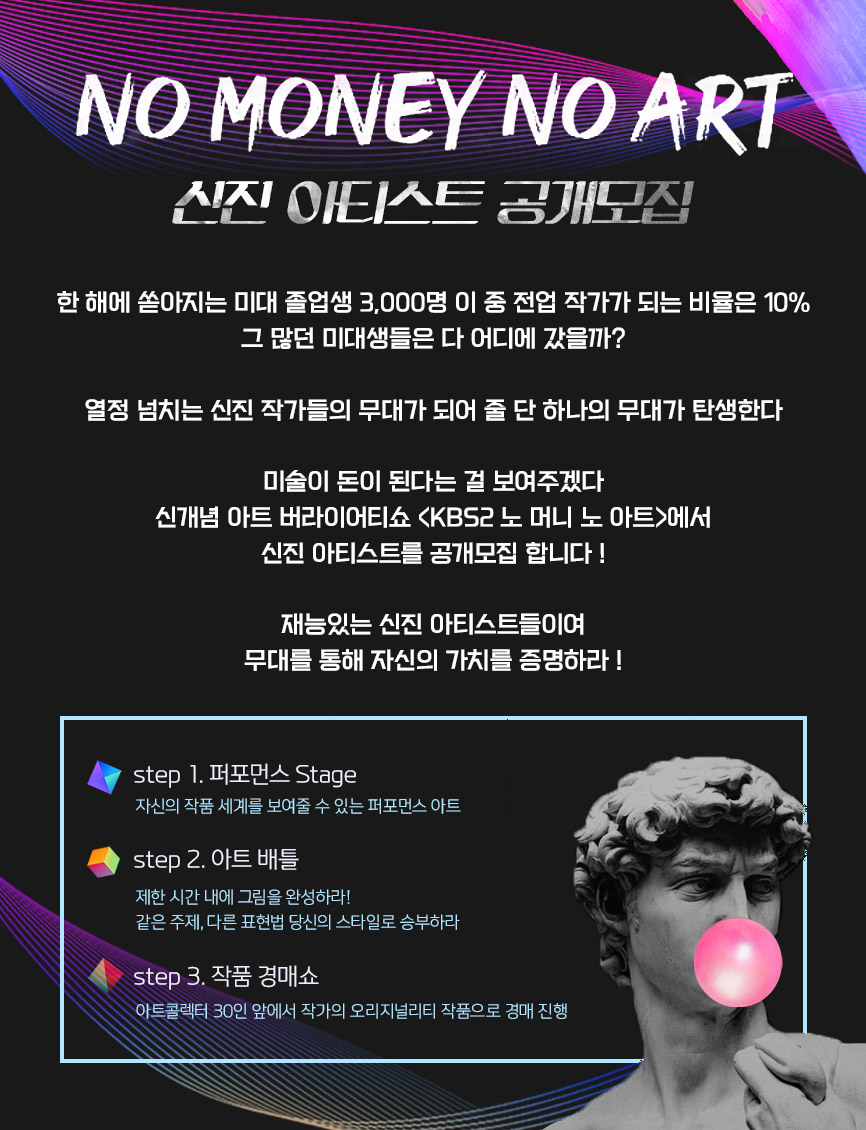 □ 모집개요 - 접수 기간 : 2022.12.21 ~ 2023.1.31 까지 지원 방법 : 기간 내, 이메일 주소로 서류 제출 < kbs_artmoney@naver.com > * 선발자는 별도의 공지 없이, 개별 연락 예정