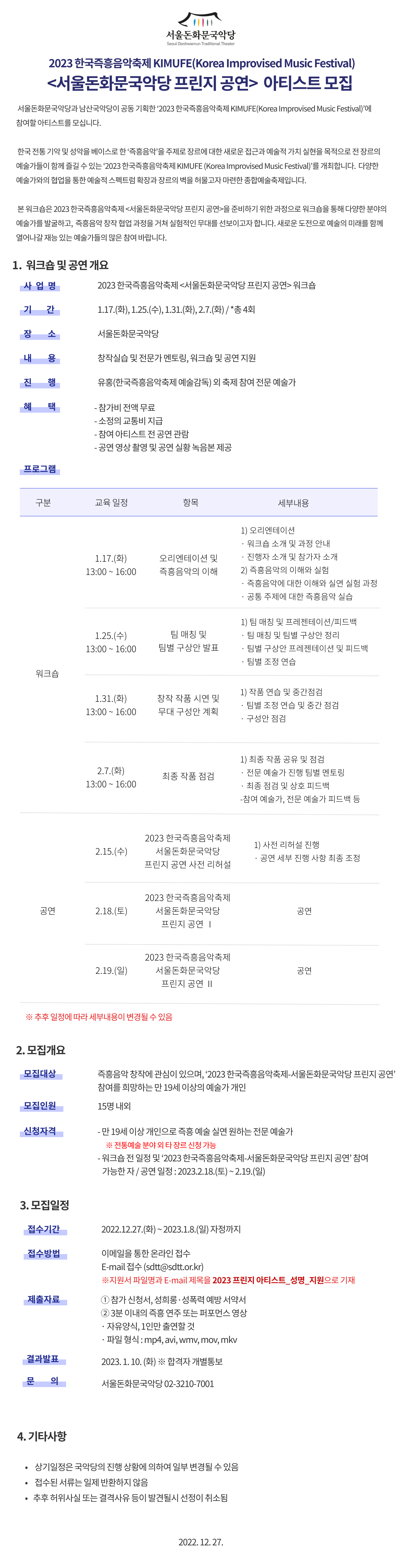 | 2023 한국즉흥음악축제 <서울돈화문국악당 프린지 공연> 아티스트 모집 공고 | |||
