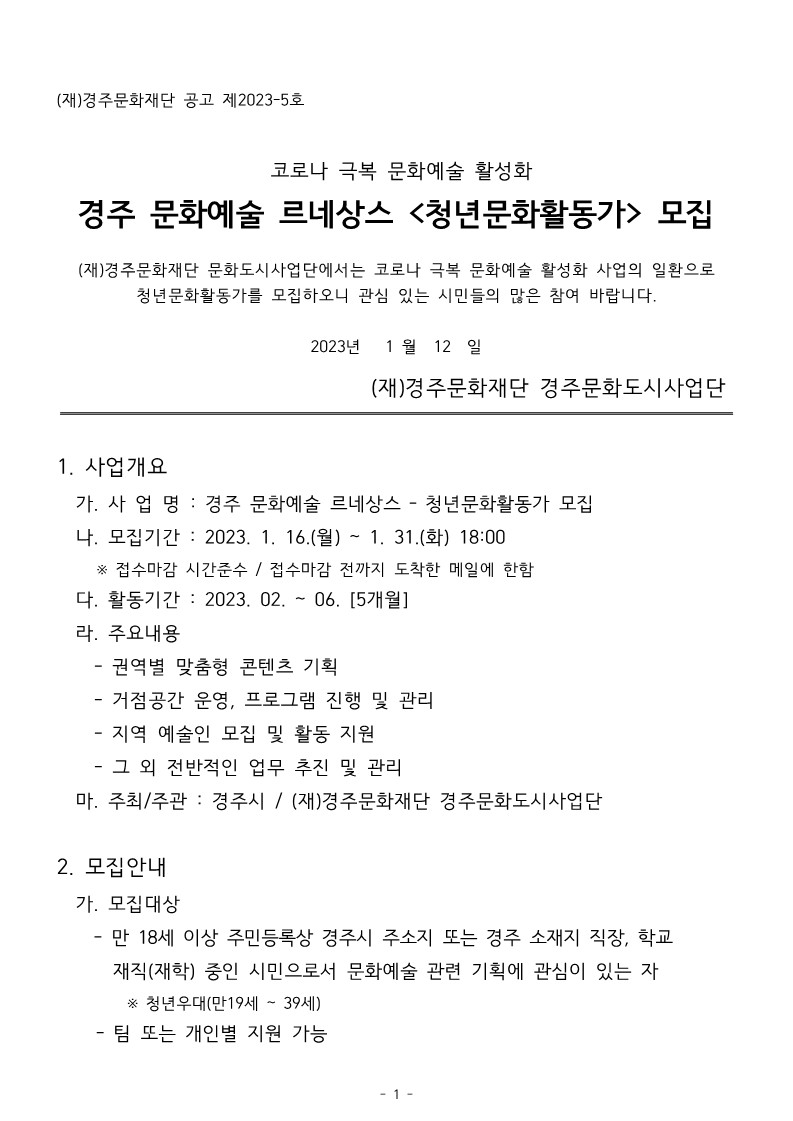 | 경주 문화예술 르네상스 <청년문화활동가> 모집 공고 | |||