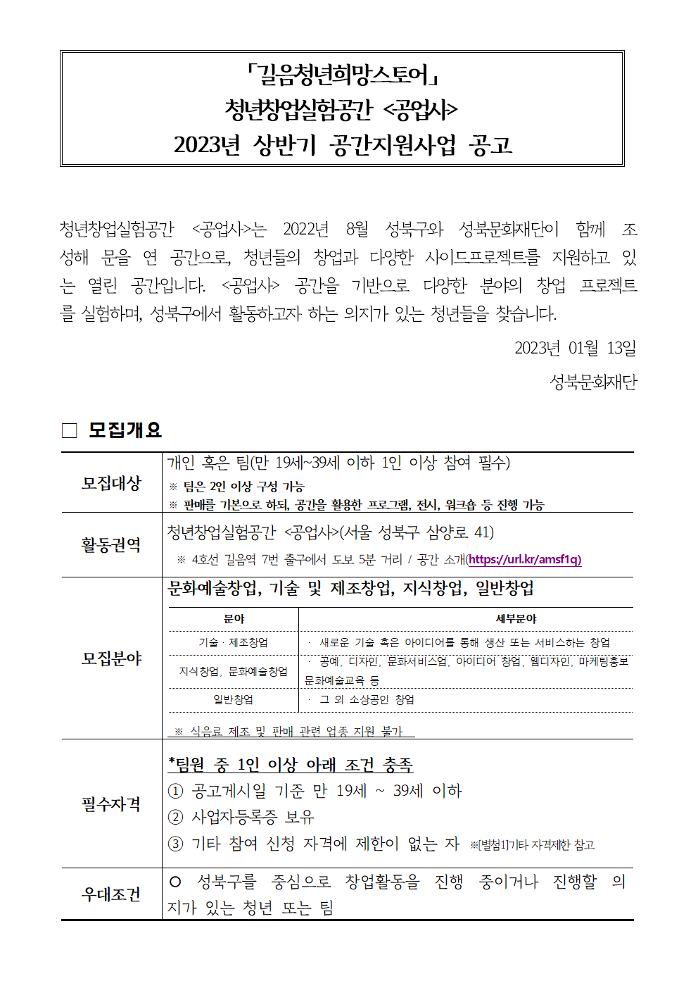 | [길음청년희망스토어] 청년창업실험공간 <공업사> 2023년 상반기 공간지원사업 공고 | |||