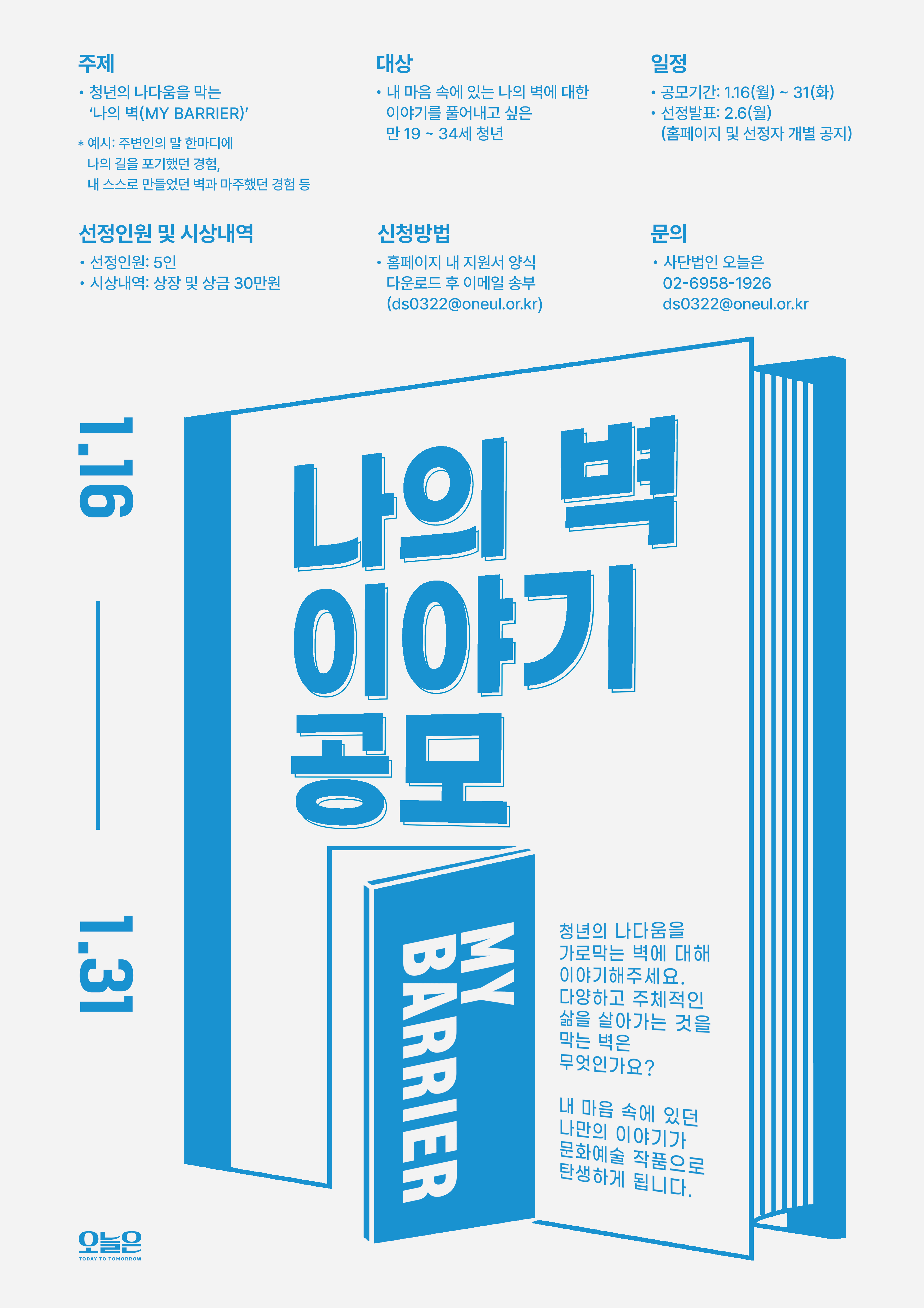 ○ 공모주제: 청년의 나다움을 막는 '나의 벽(MY BARRIER)' (예시: 주변인의 말 한마디에 나의 길을 포기했던 경험, 나의 행복을 막는 물리적인 장벽을 마주했던 경험, 내 스스로 만들었던 벽과 마주했던 경험 등) ○ 공모대상: 내 마음 속에 있는 나의 벽에 대한 이야기를 풀어내고 싶은 만 19 ~ 34세 청년 ○ 공모기간: 2023.1.16.(월) ~ 31.(화) ○ 신청방법: 홈페이지 내 지원서 양식 다운로드 후 이메일 송부(ds0322@oneul.or.kr) ○ 선정인원: 5인 ○ 선정발표: 2023.2.6.(월) 홈페이지 및 선정자 개별 공지 ○ 시상내역: 상장 및 상금 30만원 ○ 참고사항: 작품제작을 위해 3월 내 작가와의 대화에 참석(직접 또는 비대면) ○ 문의처: 사단법인 오늘은(02-6958-1926/ds0322@oneul.or.kr)