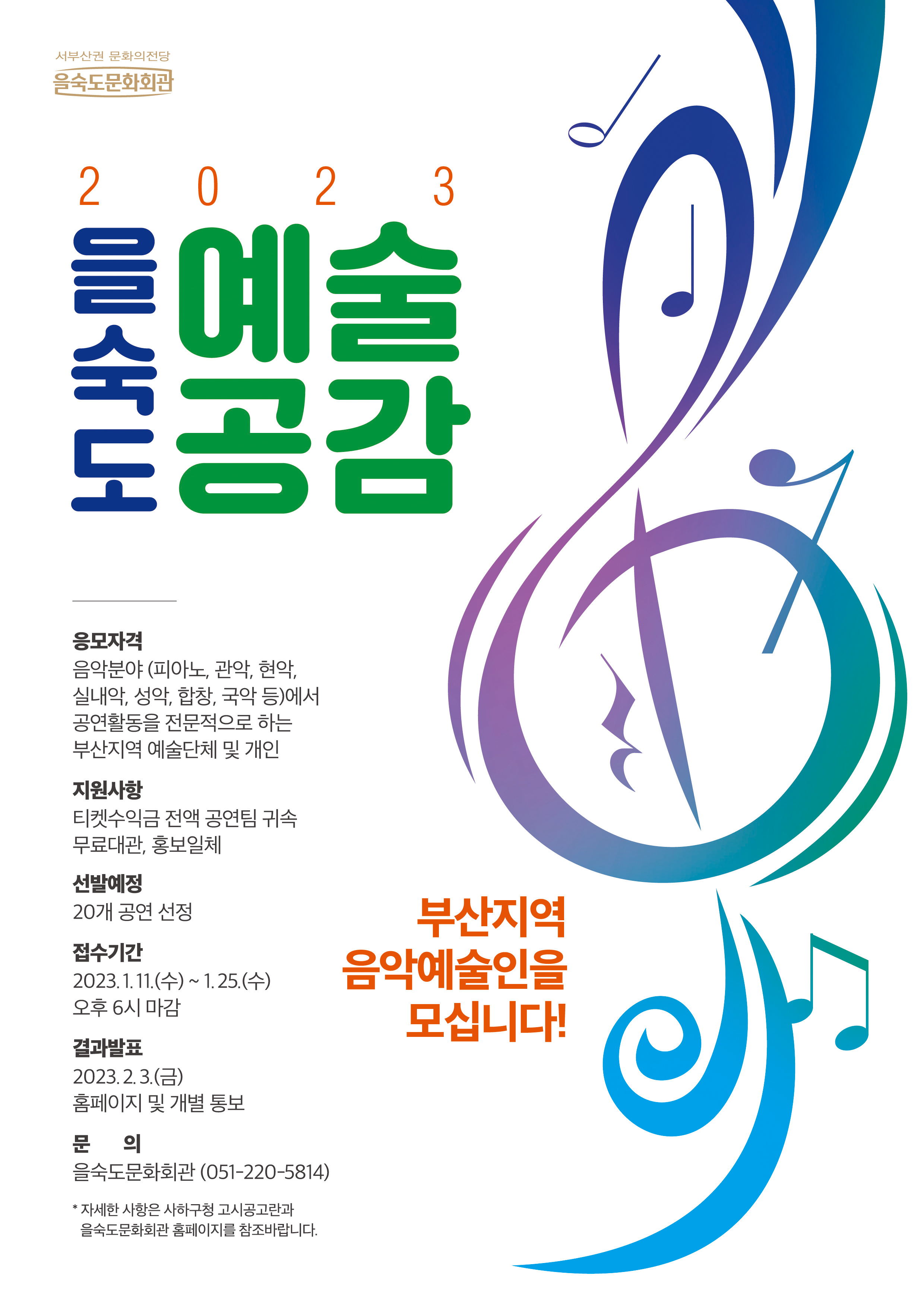 1 . 접수기간 : 2023년 1월 11일(수) ~ 1월 25일(수) 18:00마감 2. 응모자격 : 음악분야 부산지역 예술단체 및 개인 3. 접수방법 : 이메일 접수(kwonsr0103@korea.kr) 4. 지원사항 : 티켓수익금 전액 공연팀 귀속, 무료대관, 홍보일체 5. 선발예정 : 20개 이내 공연 선정 6. 선정방법 : 제출서류를 통한 서류심사 후 선정 7. 선정 심의 결과 통보 : 2022년 2월 3일 (금) - 홈페이지 게시 및 합격자 개 별 연락 *문의 : 051-220-5814