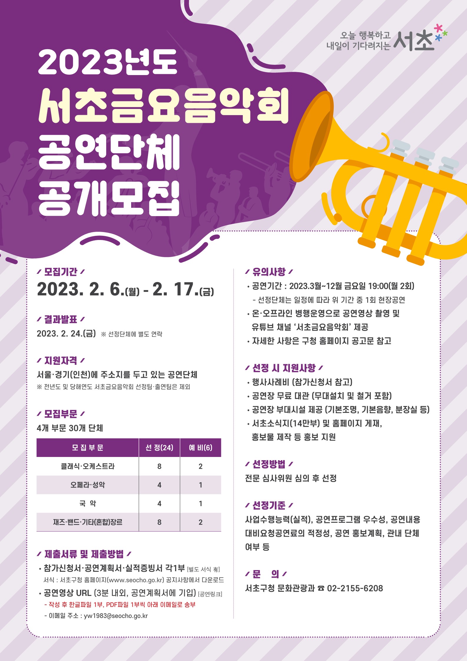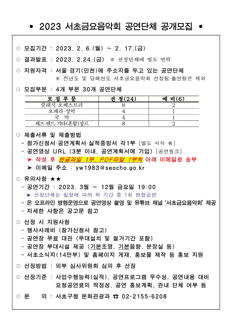 | 2023 서초금요음악회 공연단체 공개모집 안내 | |||