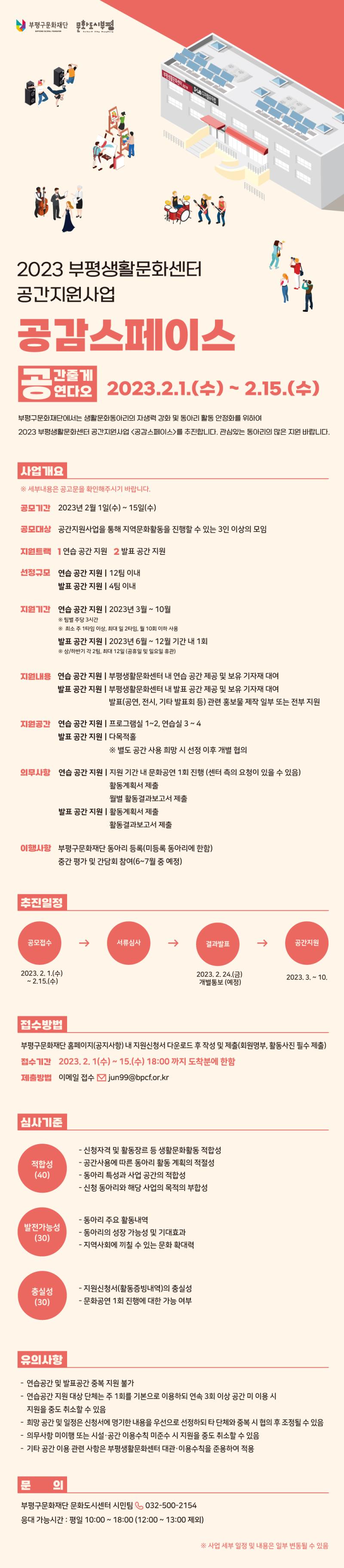 □ 사업개요 ○ 사 업 명 : 2023 부평생활문화센터 공간지원사업 <공감스페이스> ○ 공모기간 : 2023. 2. 1.(수) ~ 15.(수) ○ 지원기간 : 2023. 3. ~ 10월까지 ○ 지원내용